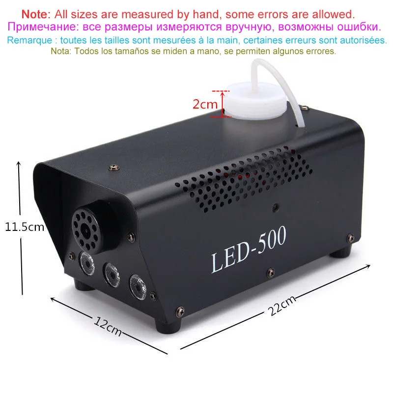 Название продукта: дымовая машинаЦвет: черныйРазмер: прибл. 220x120x115 мм (измеряется вручную, допускаются некоторые ошибки).Напряжение: 220-230 В/110 В/120 В, 50-60 ГцВремя разогрева: 2-4 минутыМощность: 500 ВтМасленка Емкость: 0,3-0,4 литровЕмкость бака: 0.5лДым outpul: 2000-3000 cufl/минВыход расстояние: 2,5 мКонтроллер управления: беспроводной пульт дистанционного управления 10 метровКласс защиты: IP20Тип источника: светодиодный светильникШтепсельная Вилка: штепсельная вилка стандарта США, штепсельная вилка европейского стандарта, штепсельная вилка стандарта Великобритании, штепсельная вилка стандарта АвстралииВес: около 1,82 кгПосылка включает:1x машина для дыма1x Кабель питания1x блок управления1x пульт дистанционного управления1x ручка2x крепежные винты1x Руководство пользователя