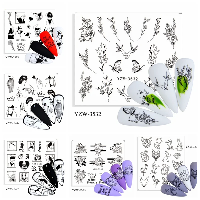 Наклейки для дизайна ногтей, черные русские буквы, цветы, этикетки, наклейки, черная абстрактная панда, лицо, 2021, новый стиль, аксессуары для украшения ногтей