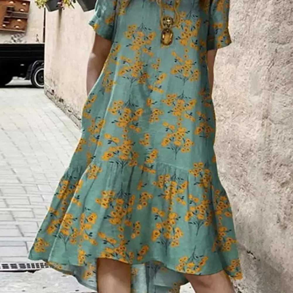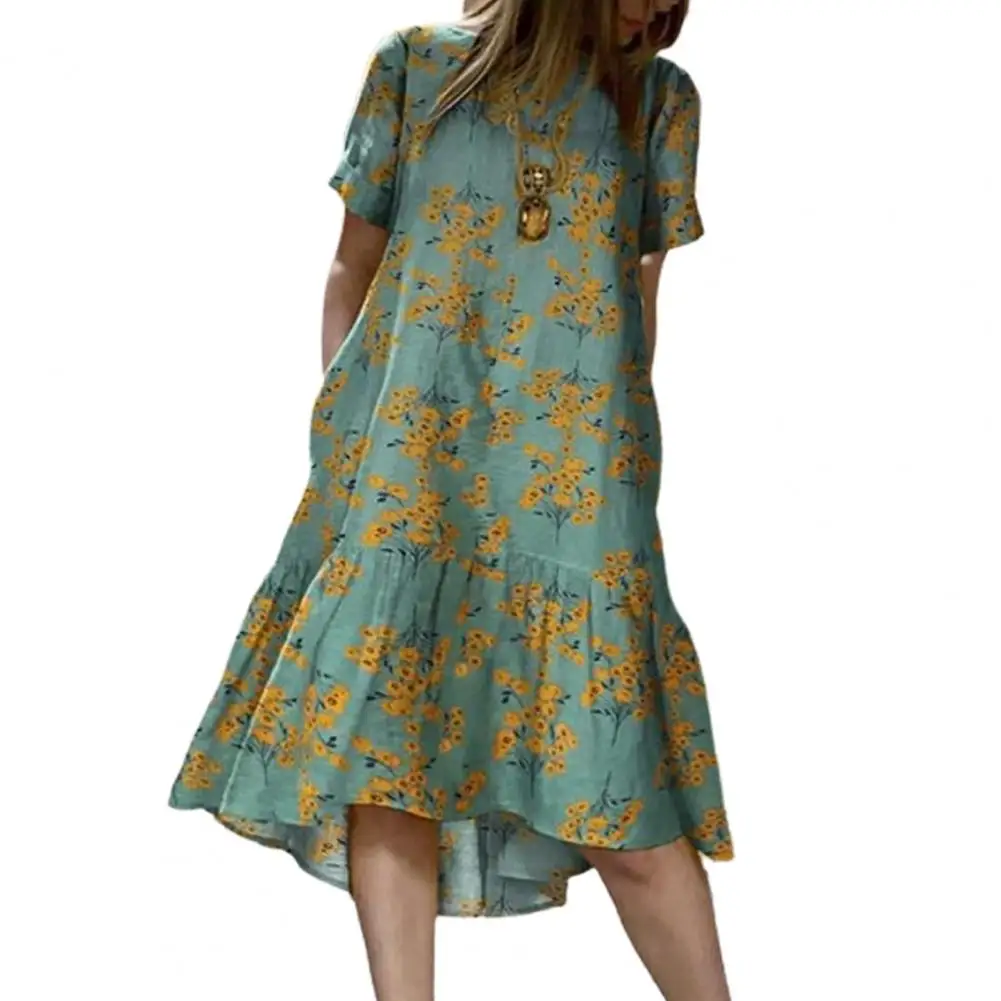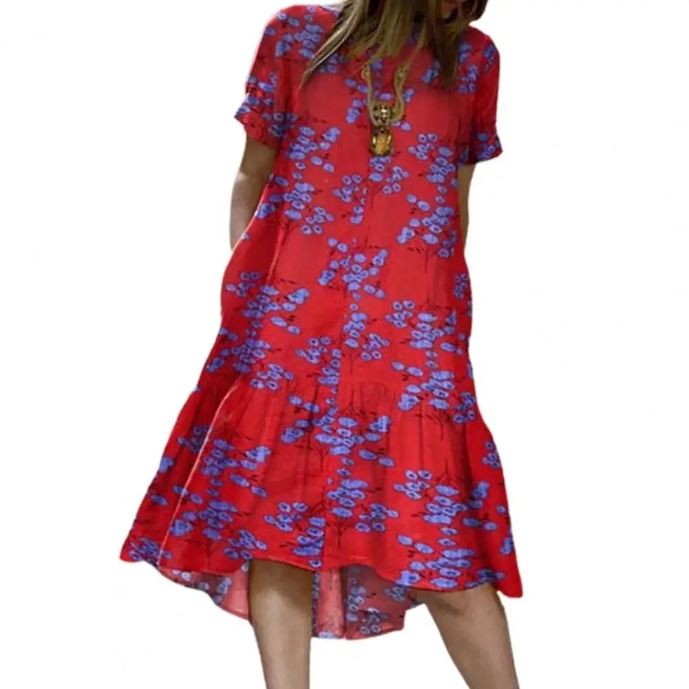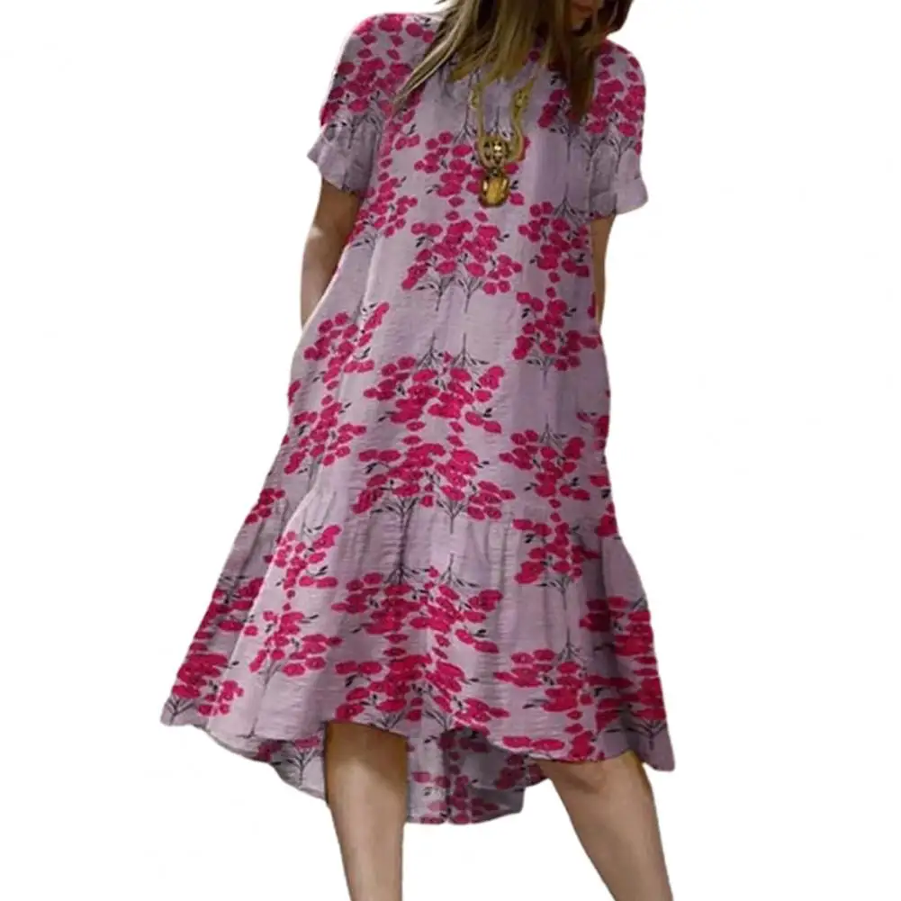 Летнее женское платье, повседневный пляжный сарафан с коротким рукавом, с цветочным принтом, с оборками на подоле, с круглым вырезом, Новинка лета 2021, женское платье миди