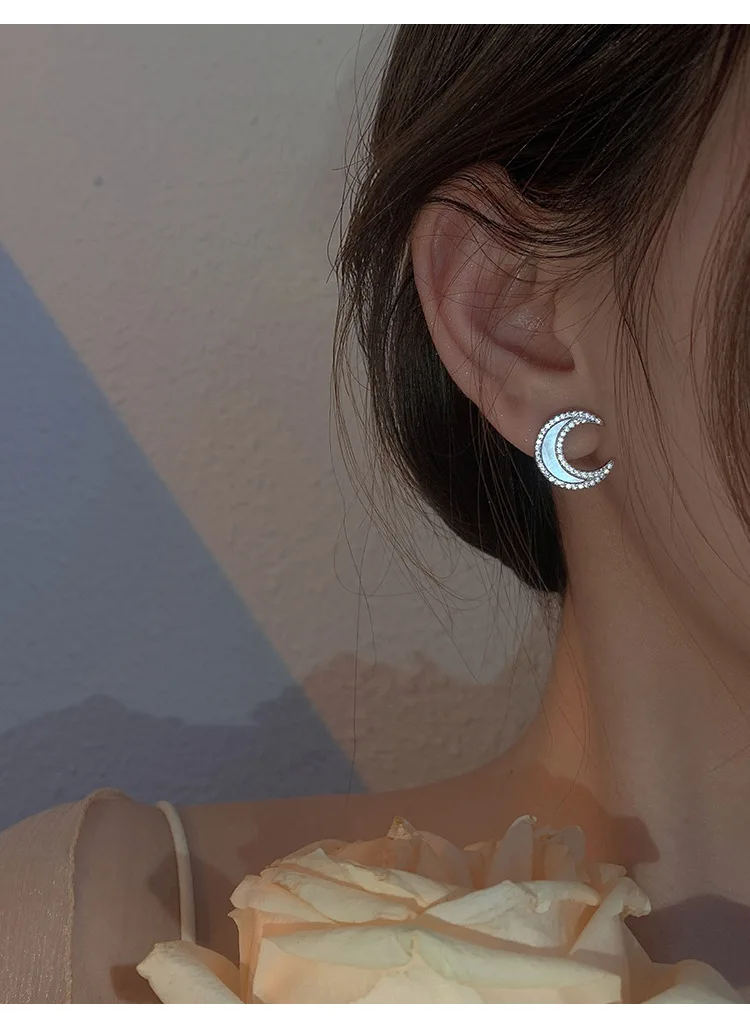 Серьги-гвоздики серебристого цвета в виде ракушки и Луны с цирконом