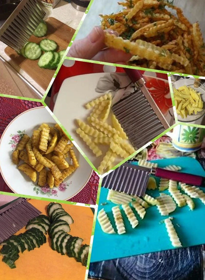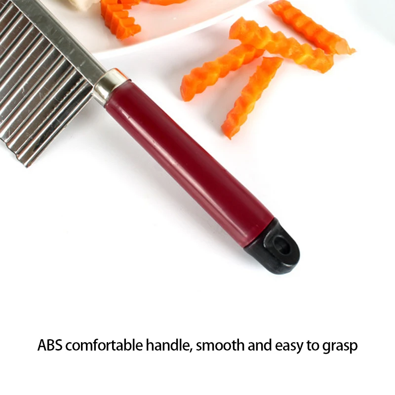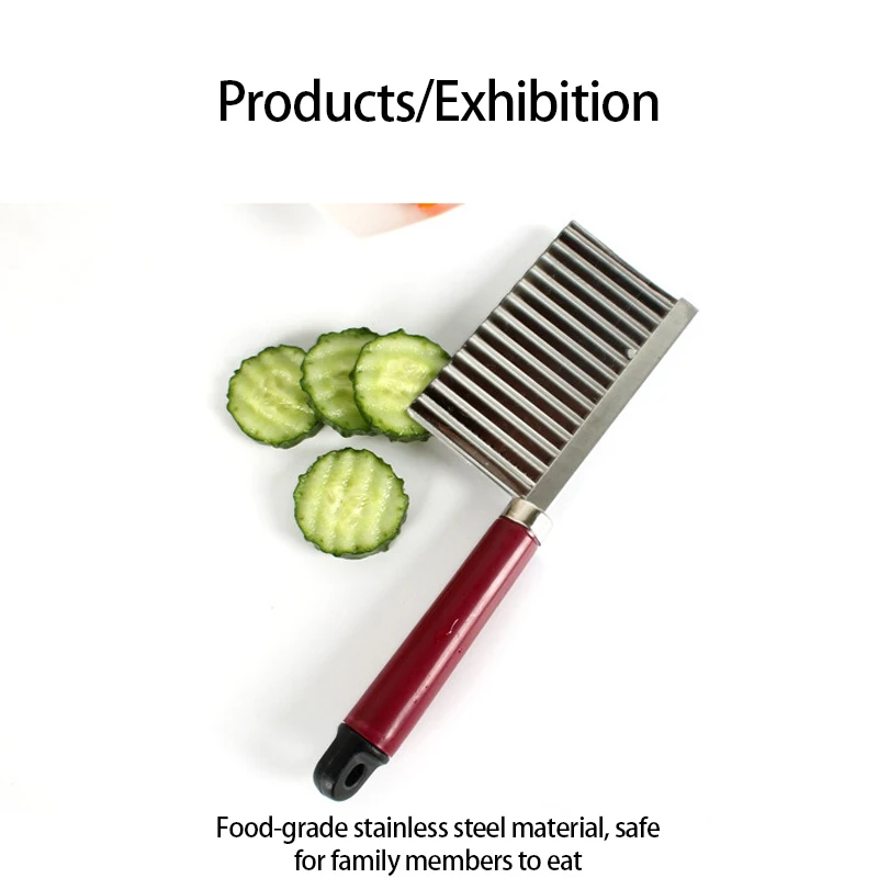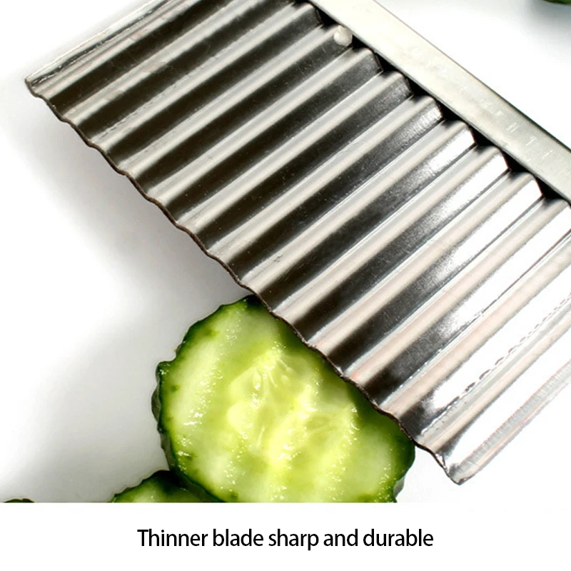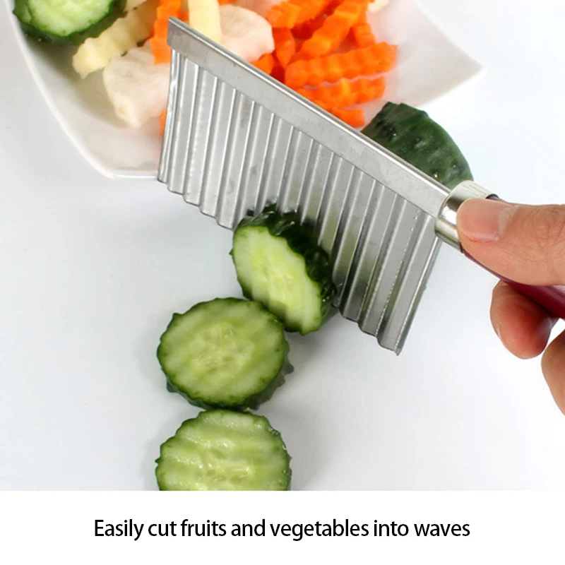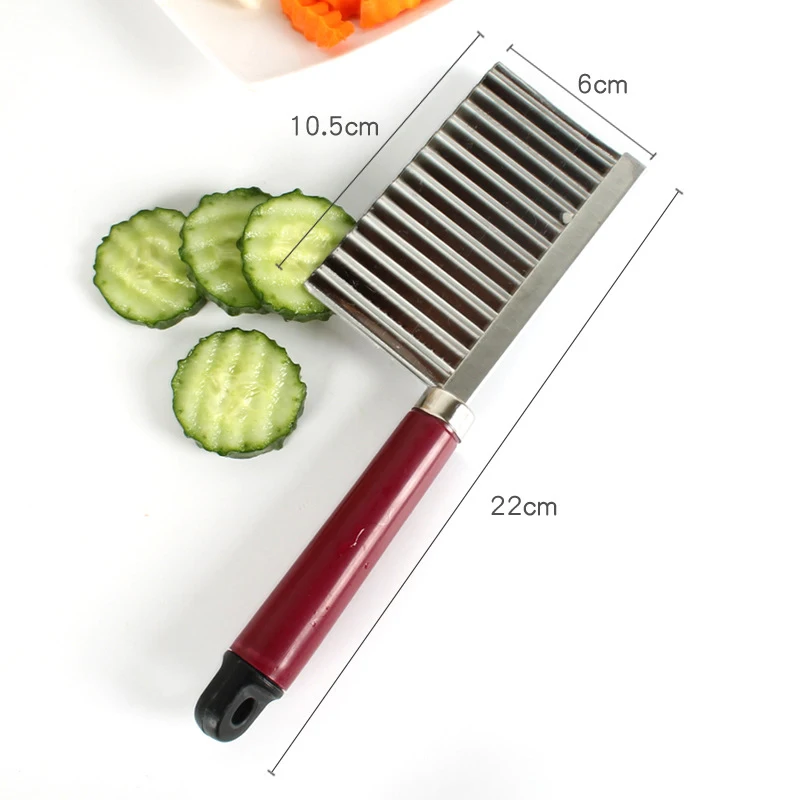 Описание:Это гофрированный резак для овощейХарактеристика:1. Этот нож прочный и долговечный, с острым лезвием.2. Подходит для картофельных чипсов ручной работы, овощей или дыни.3. Очень подходит для изготовления модных бахромой и вафель на различных фруктах и овощах.