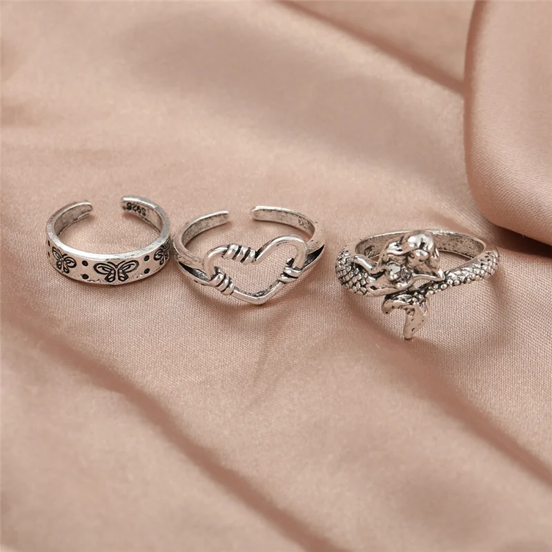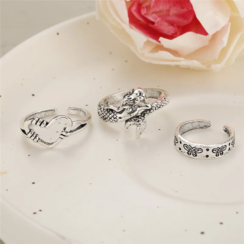 Женское кольцо с бабочкой и сердцем, винтажное, посеребренное, регулируемое, в стиле ретро, амулет-Русалка