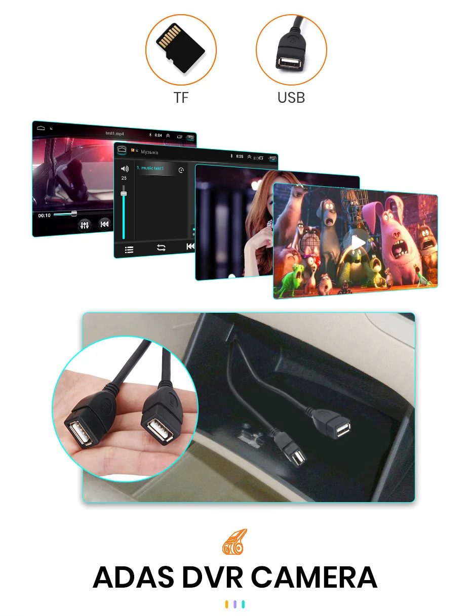 Когда автомобильное радио подключено к ADAS video recorder, это сделает передовую систему помощи при вождении, И предупредит вас, если ваш автомобиль слишком близко к переднему автомобилю или если ваш автомобиль отклоняется от полосы движения, чтобы помочь вашему вождению безопаснее и проще.