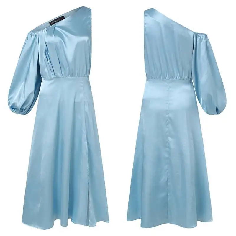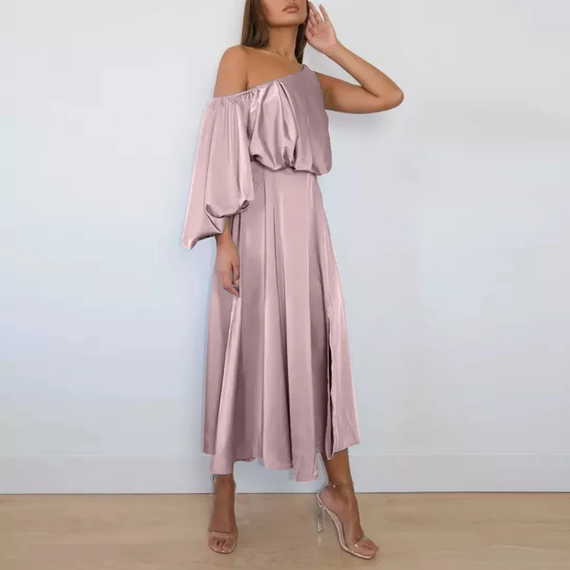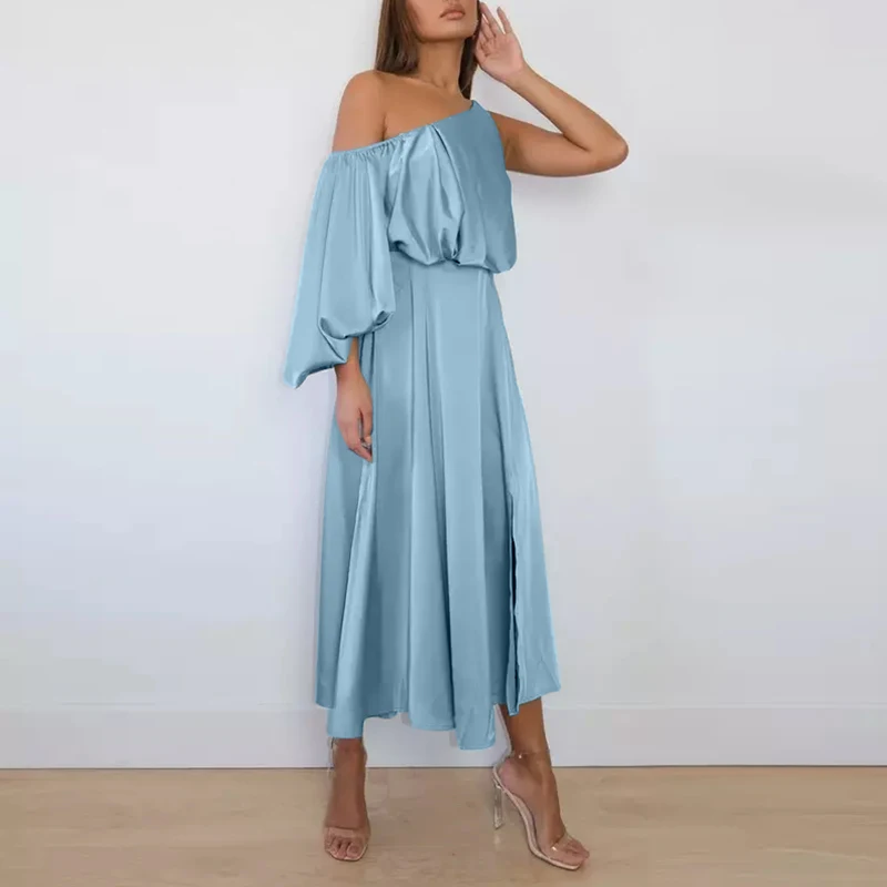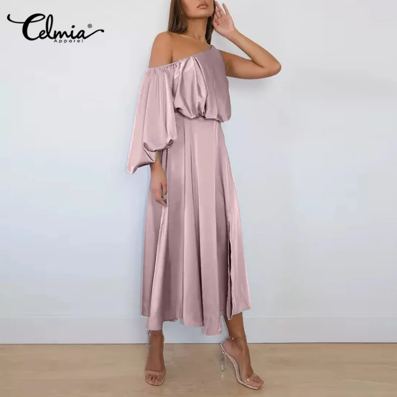 Женское элегантное атласное длинное платье на одно плечо, повседневный Длинный Сарафан Celmia с рукавами-фонариками, модные плиссированные вечерние платья с разрезом, 2022
