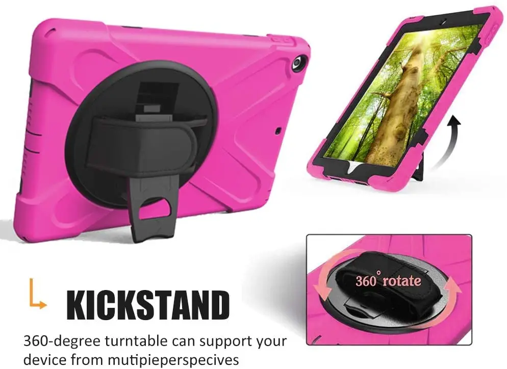Особенности: ① Встроенная подставка вращается на 360 градусов, вы можете настроить планшет под любым углом, идеально подходит для просмотра видео и общения; ② регулируемый ремешок velcor для большой и маленькой руки, идеально подходит для детей и взрослых. ③ Регулируемый и съемный плечевой ремень очень удобно, безопасно и модно вы можете носить планшет с ремнем куда угодно