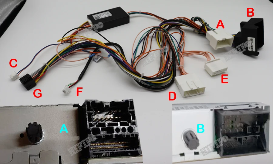 1. Разъем A-это разъем питания Fluence.2. Разъем B-это разъем питания Megane 3.3. Разъем C должен быть вставлен в порт CAN хоста навигации.4. Разъем D должен быть подключен к штепсельной вилке оригинального экрана.(После подключения оригинальной вилки, есть место в центральной консоли, где может быть вставлен маленький экран)5. Разъем E должен быть вставлен в оригинальный заводской экран, а затем поместите оригинальный заводской экран в ящик для хранения автомобиля, чтобы он мог продолжать работать.6. Разъем F не должен подключаться к любой вилке, просто оставьте ее открытой.7. Разъем G предназначен для подключения шнура питания к задней части нового радио.