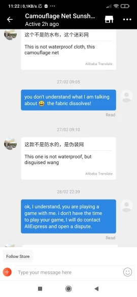 Очень плохое качество, ткань разваливается, и ткань на самом деле не прикреплена к сетке, вам нужно восстановить ее самостоятельно. Он может быть хорош для использования в помещении, но точно не для использования на открытом воздухе! Ветер и солнце быстро разрушают его, ткань будет по всему вашему месту. Я даже не пробовал его на открытом воздухе, потому что он выглядит уже как плохо сделанный. Я бы не купил это снова. Продавец начинает какой-то странный разговор, он вообще не слушает жалобы покупателя.