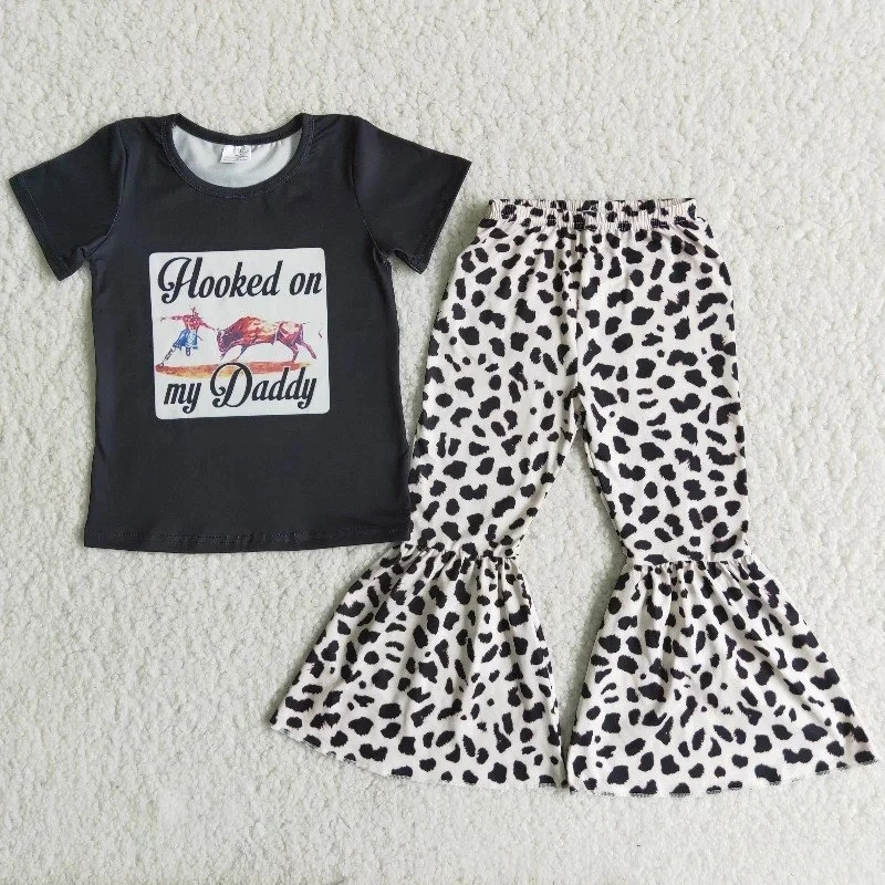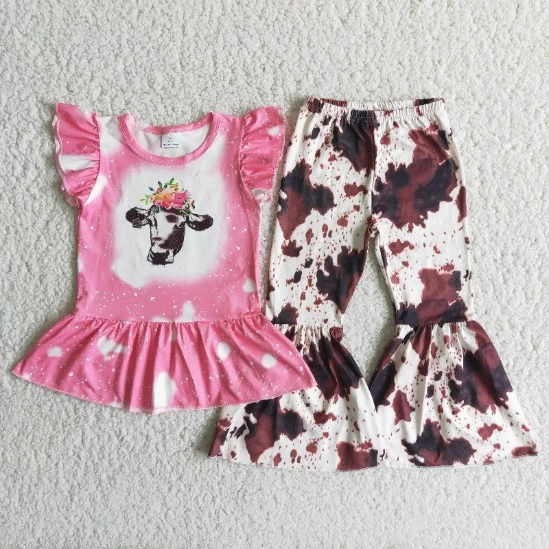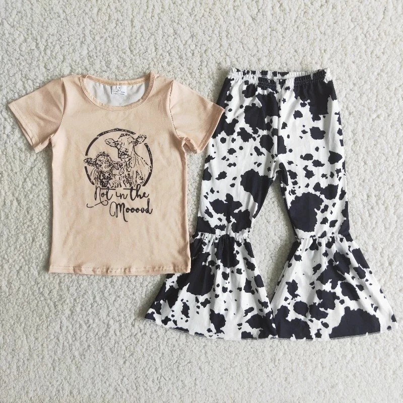 Оптовая продажа, детская одежда цвета хаки, рубашка с коротким рукавом из коровьей кожи, зеленые брюки с пиктографом и колокольчиками, наряд для маленьких девочек, Модный комплект для детей