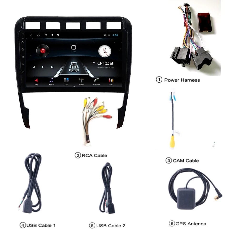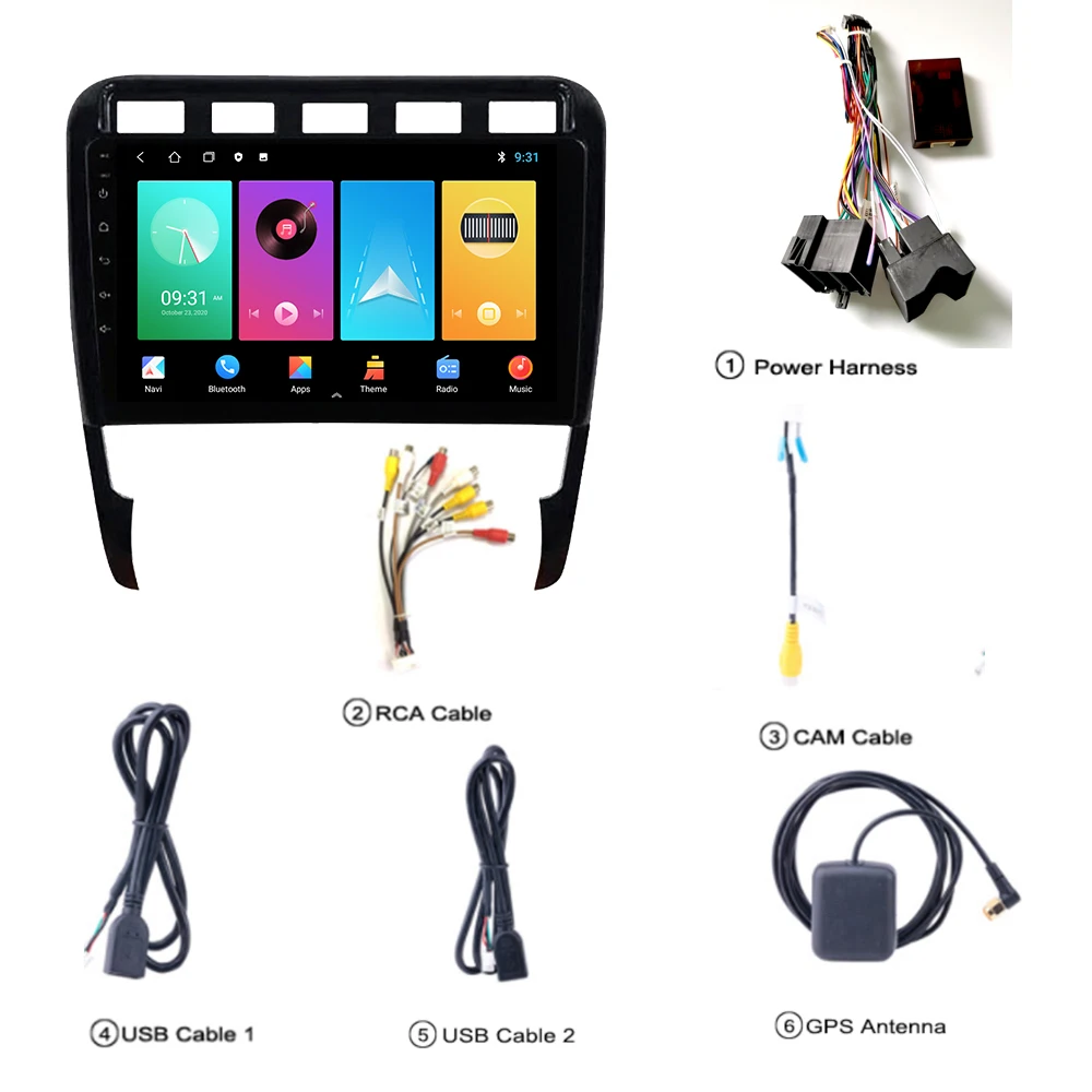 1 x автомобильный радиоприемник Porsche Cayenne Android 1 х Кабель питания 1 x Антенна GPS 1 x вход камеры 1 х RCA вход и выход 2 x USB кабель Руководство по эксплуатации-1 шт.