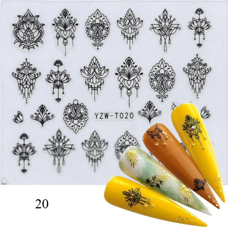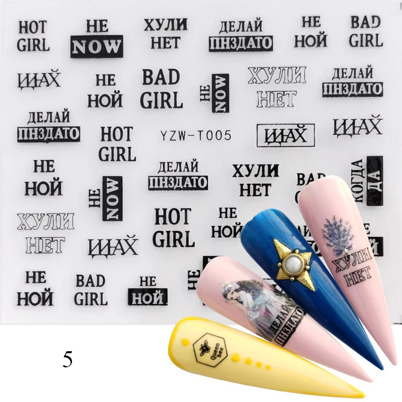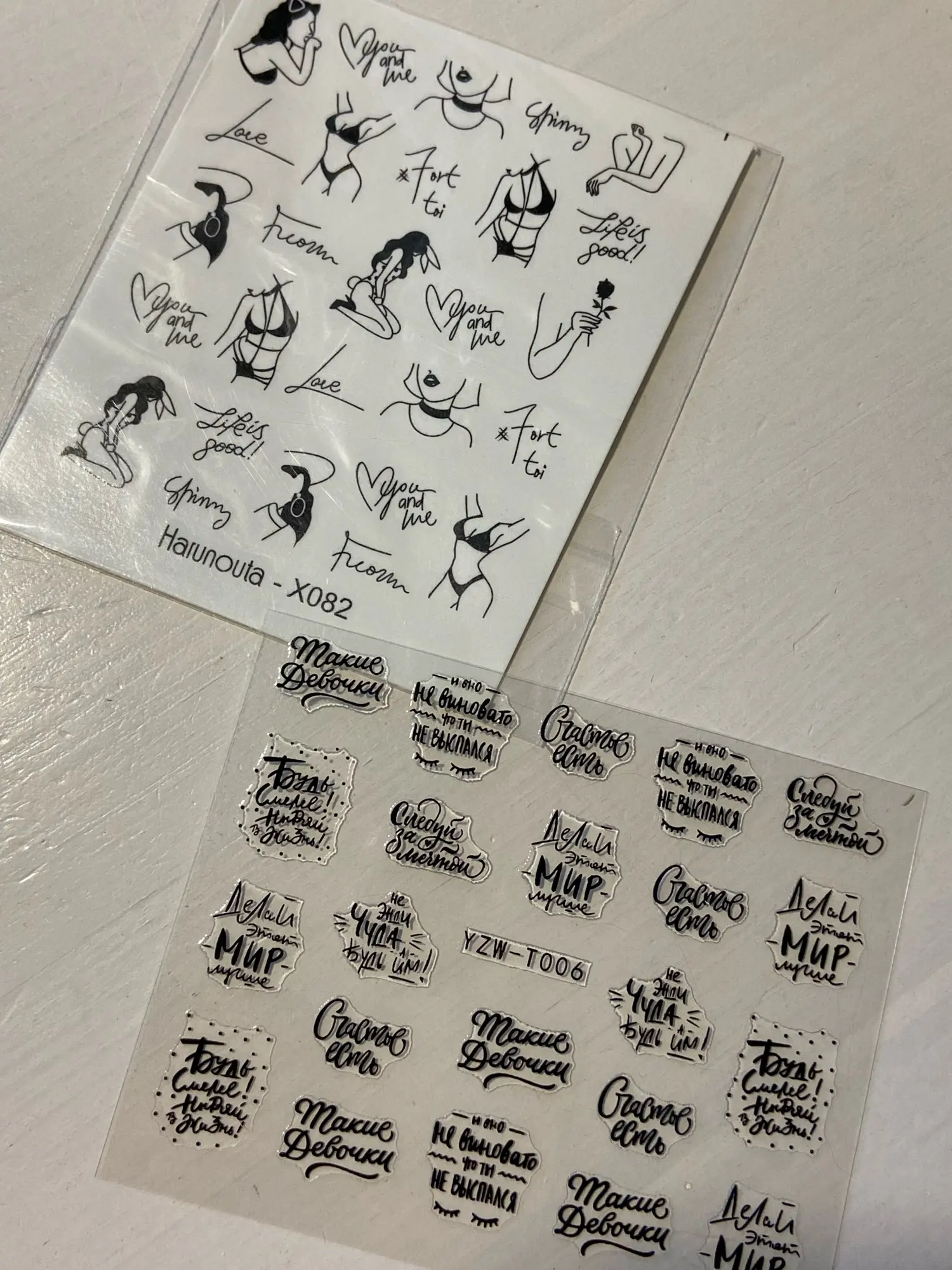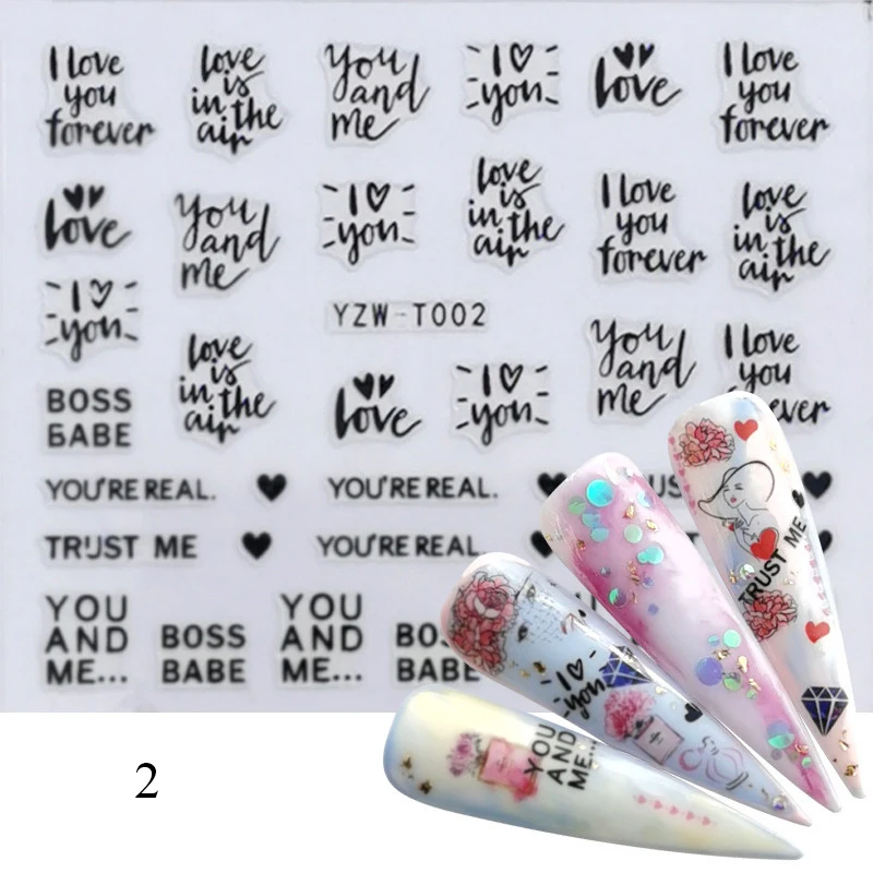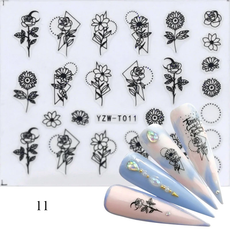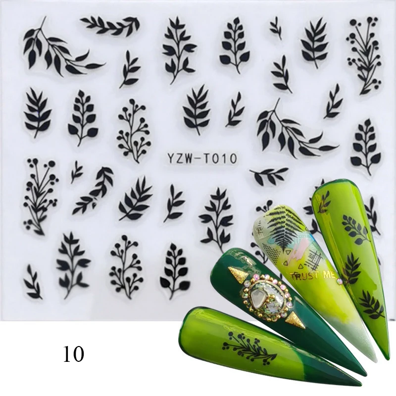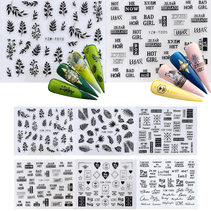 Наклейки для ногтей, черные буквы, листья, цветы, 1 лист