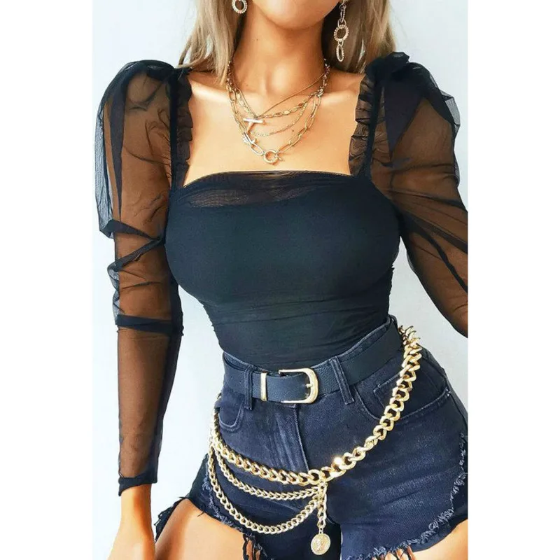 Женская пикантная Повседневная однотонная сетчатая Лоскутная Блузка с пышными рукавами и рюшами стильная блузка с квадратным вырезом Женский Повседневный Топ