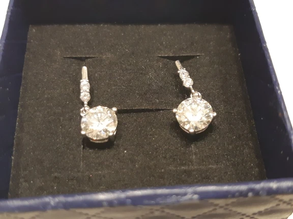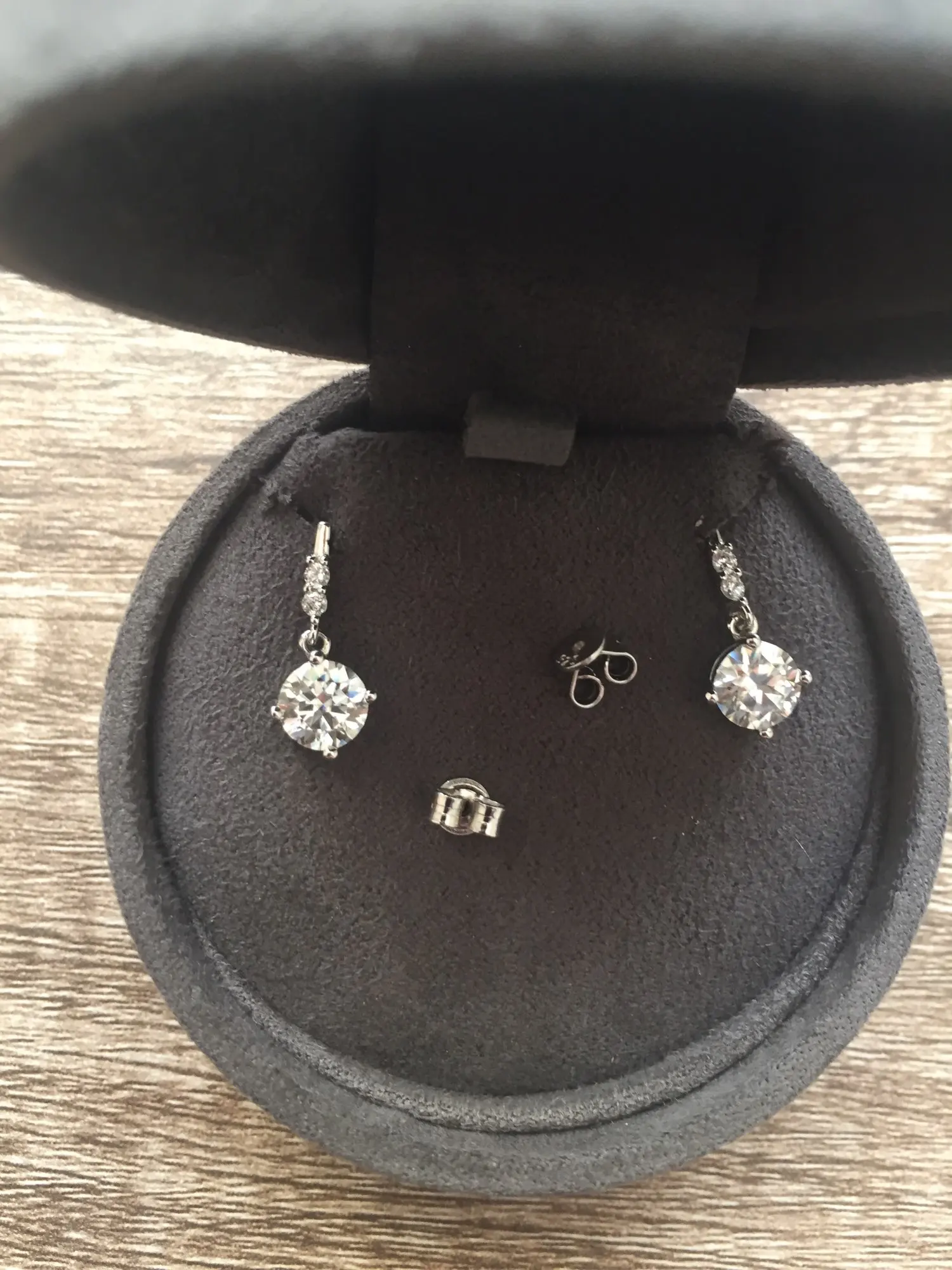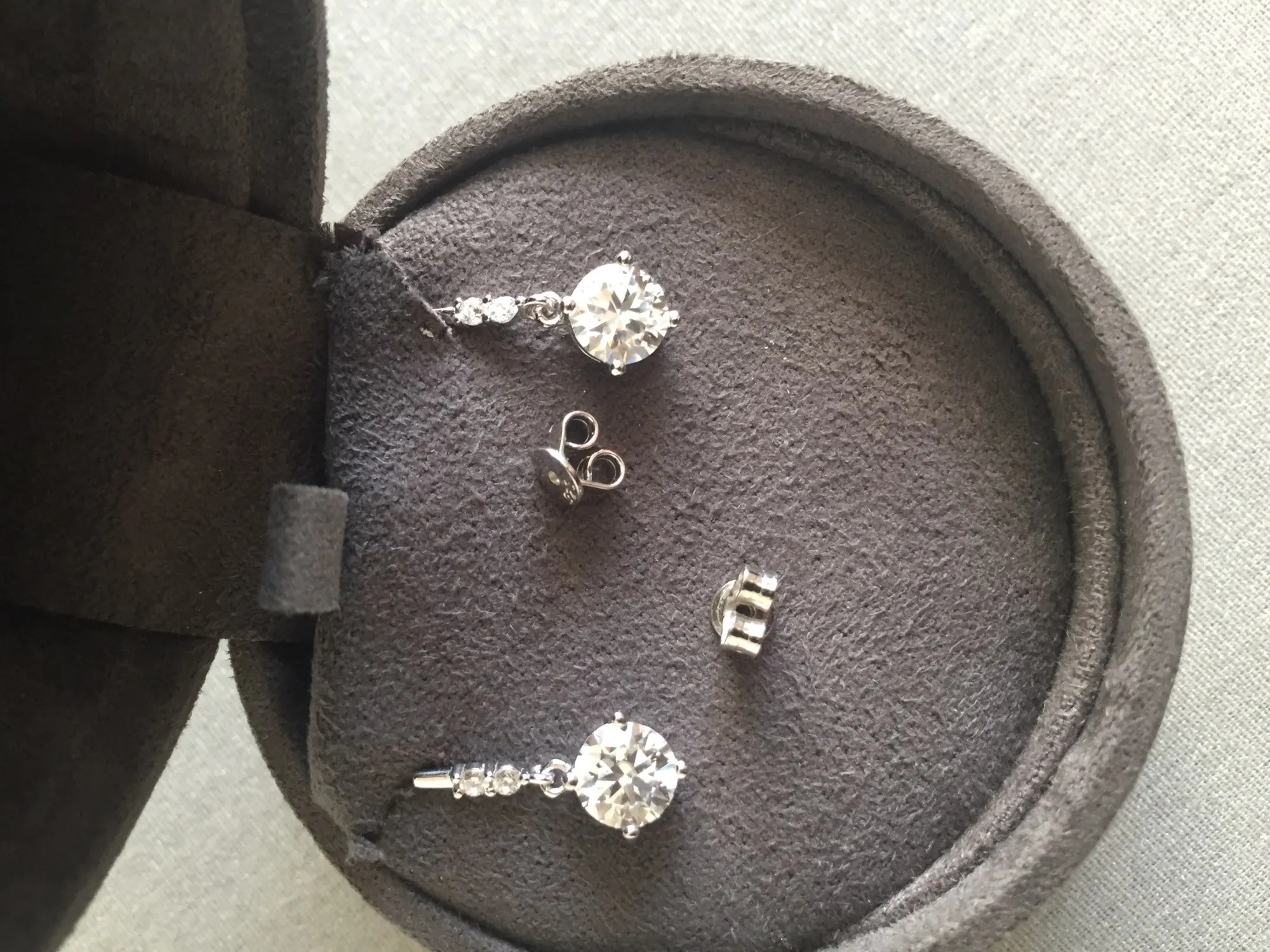 Красивые серьги, очень легкие, с 2 сертификатами на каждый камень, штампованные 925 пробы; Прибыл в течение 2 недель. Имейте в виду, что вес 1 карат одного камня, а не общего веса, как обычно, для сережек. Если бы я был уверен, что закажу 0,5 карата каждого, чтобы выглядеть более реальным. Поэтому, может быть, всегда имеет право спросить, продавец общается очень быстро. Все еще очень хорошая замена для путешествий, спасибо!
