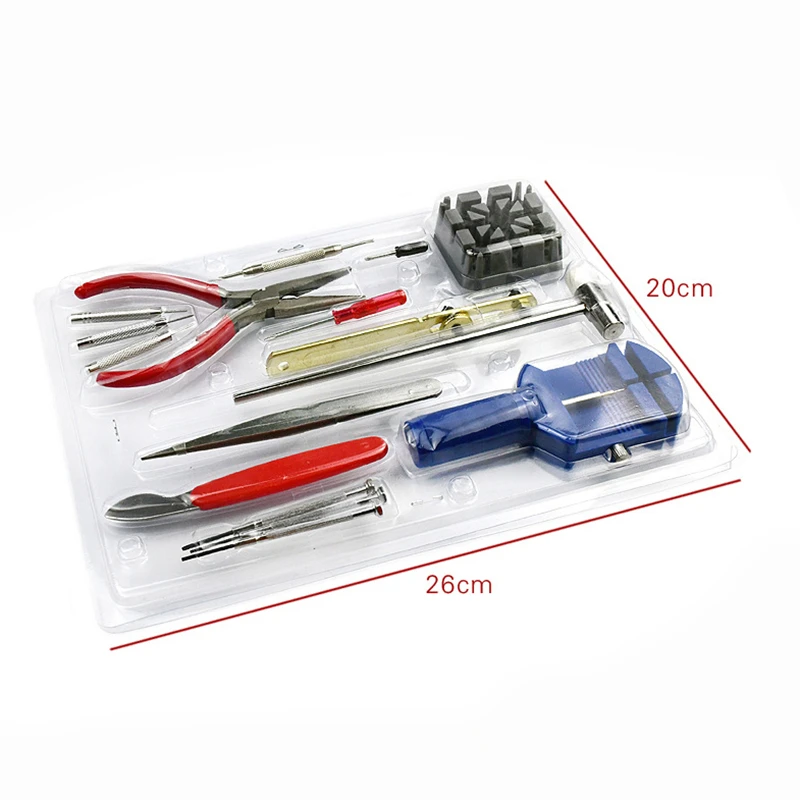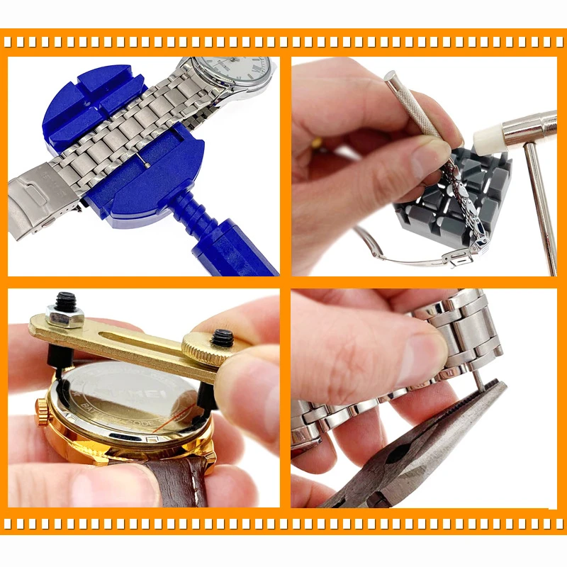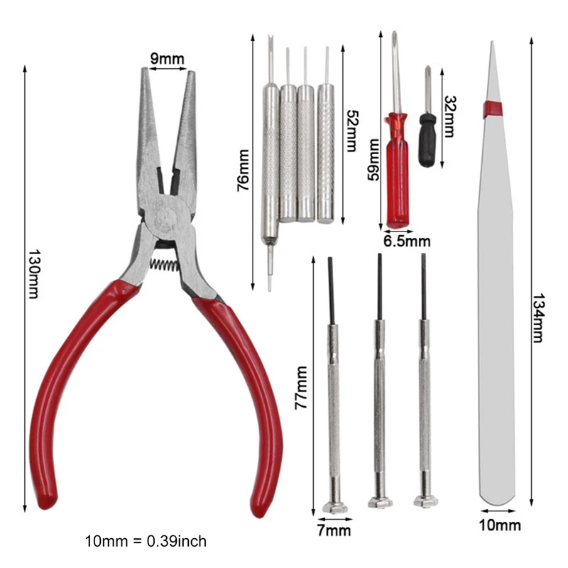 16 инструментов для ремонта часов, включает в себя: инструмент для удаления звеньев, чехол для часов,Мягкая рабочая площадка, двухголовый молоток (нейлон/сталь), чехол для открыванияНож, тонкий пинцет, плоскогубцы, инструмент для пружинных прутков и пинцет для звеньев и отвертки.Практичный и многофункциональный высококачественный и прочныйИспользуется для ремонта и демонтажа часов, удаления батареи, домашнего простого обслуживания и других операций.Материал: металл + пластик
