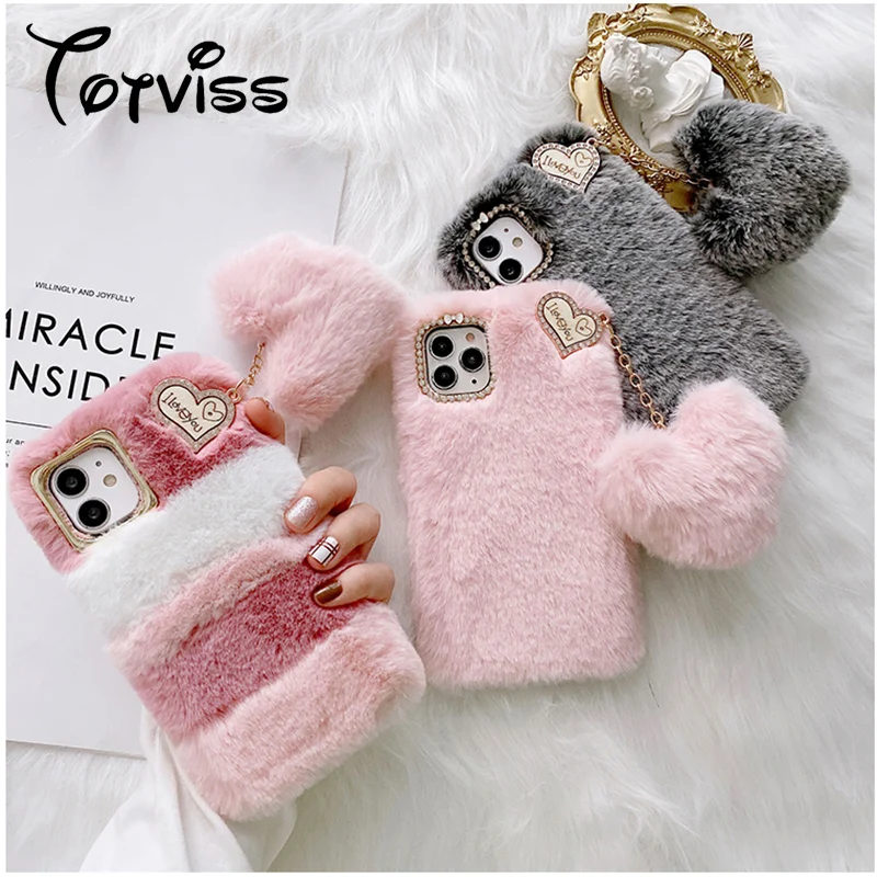 Роскошные Love подвесной Чехол для мобильного телефона для iPhone 12 Pro Max 11 X XS XR 8 7 6 6S Plus SE 2020 5S 5C 4S милые теплые прошитой подошве; Теплые зимние плюшевые тапочки с мехом чехлы