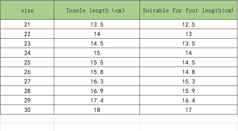 Chers amis:Parce que toutes les tailles de chaussures pour enfants sont différentes, lorsque vous commendez les chaussures pour enfants, vous devez en fonction de notre taille et de notre longueur interne.Selon la longueur de la semelle intérieure. (longueur de la semelle intérieure = longueur du pied + 1 см)La taille américaine n'est pas Standard, juste pratique pour vous de faire la commande.La longueur удобный la longueur du pied ajouter environ 1 см.Et en raison du long délai de livraison par авиа-отправление Почты Китая et l'enfant grandira vite, veuillez choisir des chaussures de plus grande taille pour votre enfant.Veuillez choisir la bonne taille.Toutes les chaussures seront expédiées avec des sacs à bulles, pas de boîtes!
