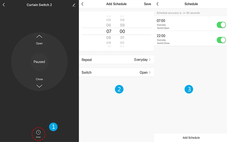 Вы можете сделать auotomation и сцен в приложении, и установить таймер, когда открыть, когда закрыть Пульт дистанционного управления с настенным креплением, вы можете установить его на стену, где вам будет удобно