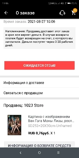 Прождал отправки несколько дней, но так и не отправили посылку. Заказ отменился автоматически, оплата вернулась.