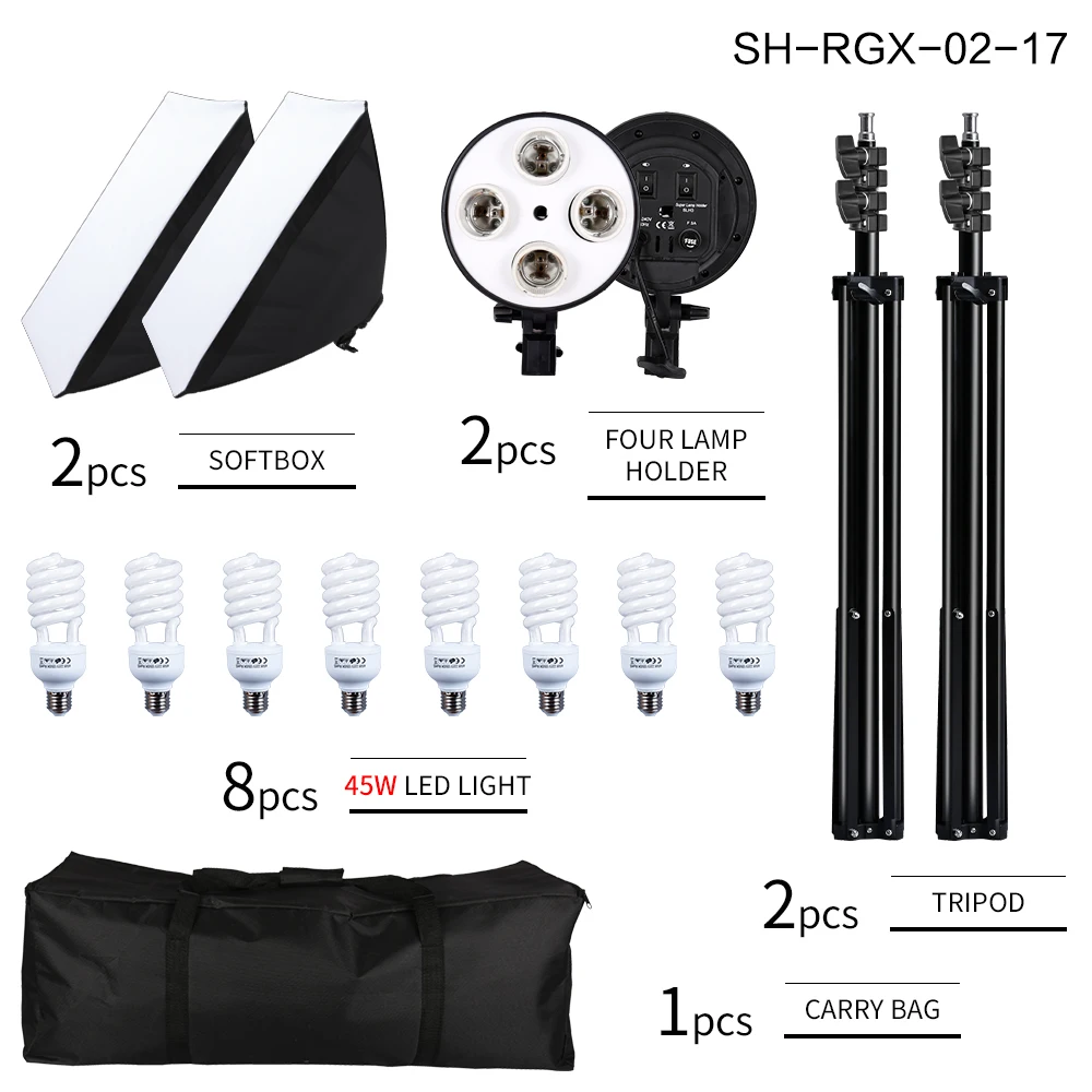 2 шт. четыре лампы софтбокс2 шт. 2 м штатив8 шт. 45 Вт лампы1 шт. сумка Оксфорд