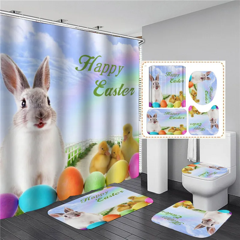 Счастливы с мультипликационным принтом кролик Водонепроницаемый Душ занавес ковер набор нескользящий коврик для ванной комнаты Крышка для туалета для ванной и душа; Домашние занавески украшения