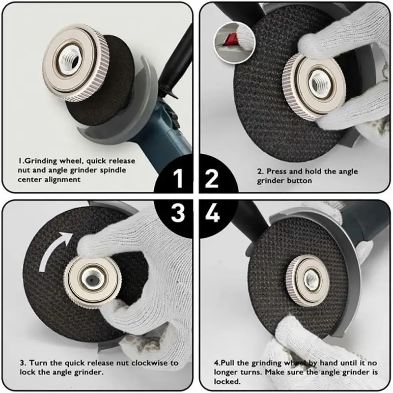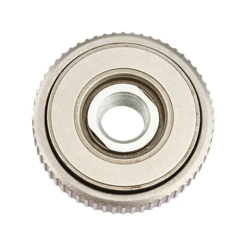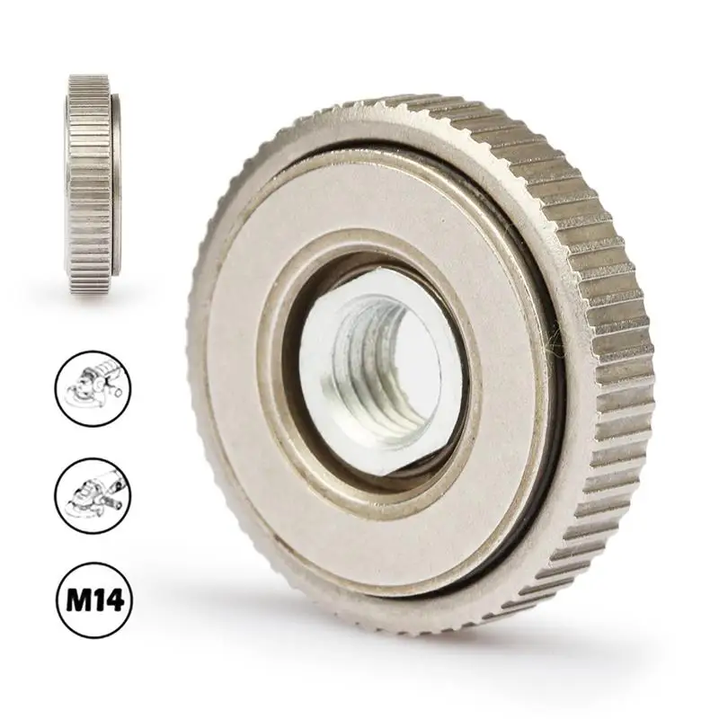 Особенности:[Изысканное мастерство]: матовый пол имеет тонкую текстуру, что увеличивает трение, а гайка надежно фиксирует шлифовальный круг, его нелегко скользить.[Отличный материал]: Эта угловая шлифовальная машина с зажимной гайкой изготовлена из высокопрочного сплава, отличается высокой прочностью без деформации, выдерживает крутящий момент 40 н и высокую скорость 12000 об/мин. С гарантированным качеством и длительным сроком службы.[Простое управление]: БЫСТРОРАЗЪЕМНАЯ гайка угловой шлифовальной машины имеет быструю фиксирующую структуру, которую можно очень надежно затянуть, и ее нелегко снять. Его можно затянуть или ослабить без гаечного ключа. Процесс использования очень простой и быстрый.[Широкий спектр применения]: Зажимная гайка подходит для всех угловых шлифовальных машин с интерфейсом M14 на рынке, используется для угловых шлифовальных машин и режущих машин со скоростью 1200 Вт 125 об/мин и диаметром полировального диска. Например, алмазные отрезные диски, шлифовальные диски, шлифовальные диски в форме чашки, алмазные пластины и другие типы шлифовальных кругов.