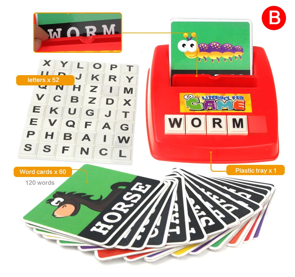 A: 1 пластиковый лоток, 30 карточек, 26 буквB: 1 пластиковый лоток, 60х текстовые карты, 52 x буквы