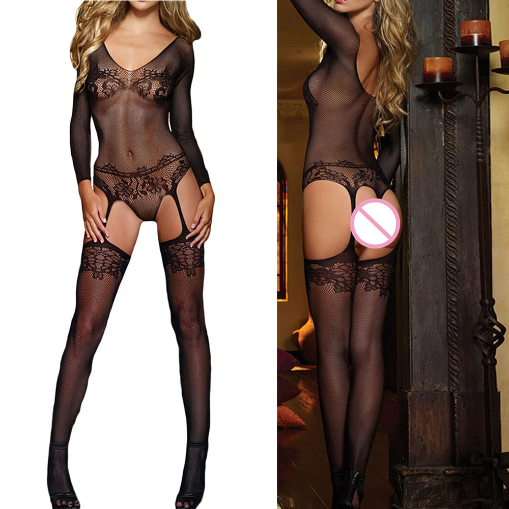 Эротический боди женское белье сексуальное кружевное Боди Чулки эротическое женское черное боди с открытой промежностью прозрачная обтягивающий костюм в сеточку Одежда