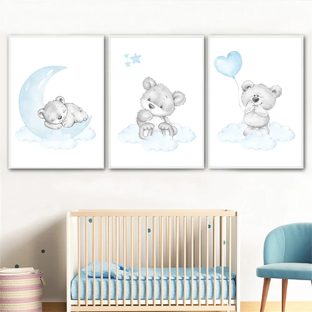 Художественная живопись с изображением голубой луны облака детский медведь искусство на холсте Детские скандинавские настенные картины декор для детской комнаты