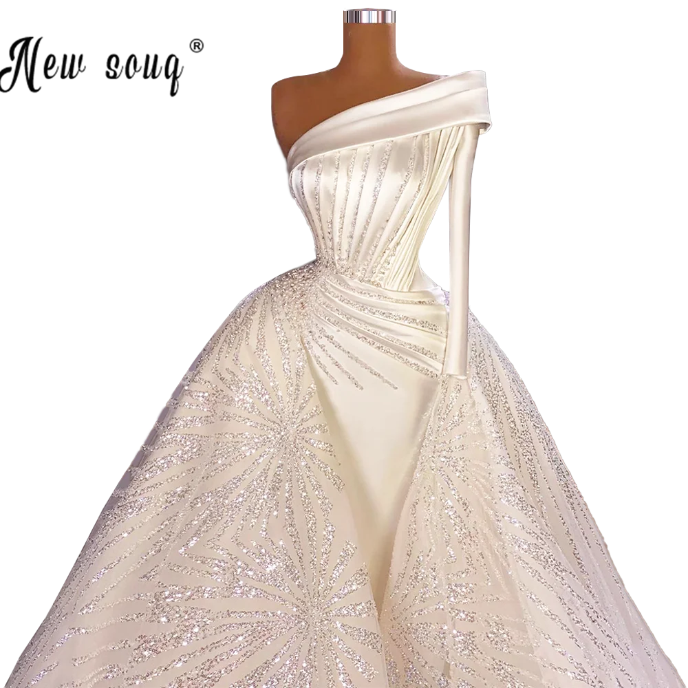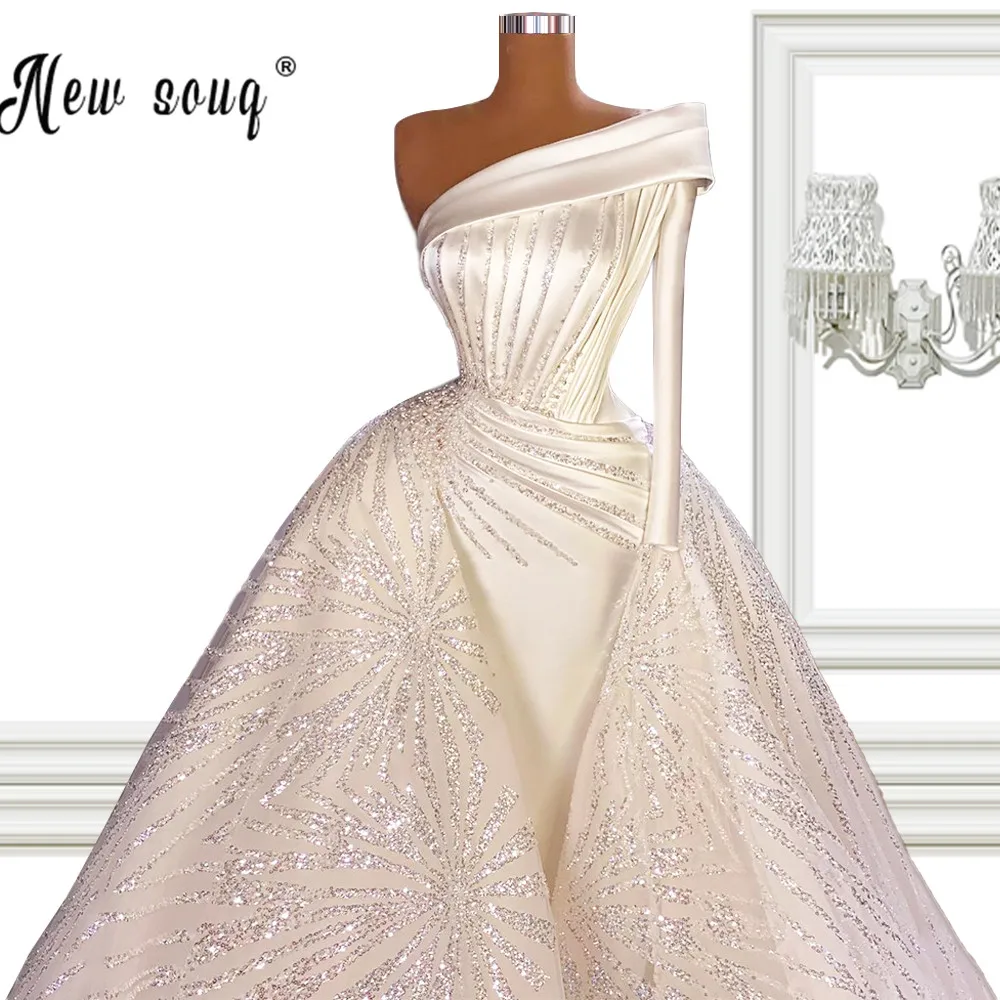 Атласное свадебное платье на одно плечо с длинным рукавом 2021 с элегантным съемным воротником со шлейфом Свадебные платья с бусинами