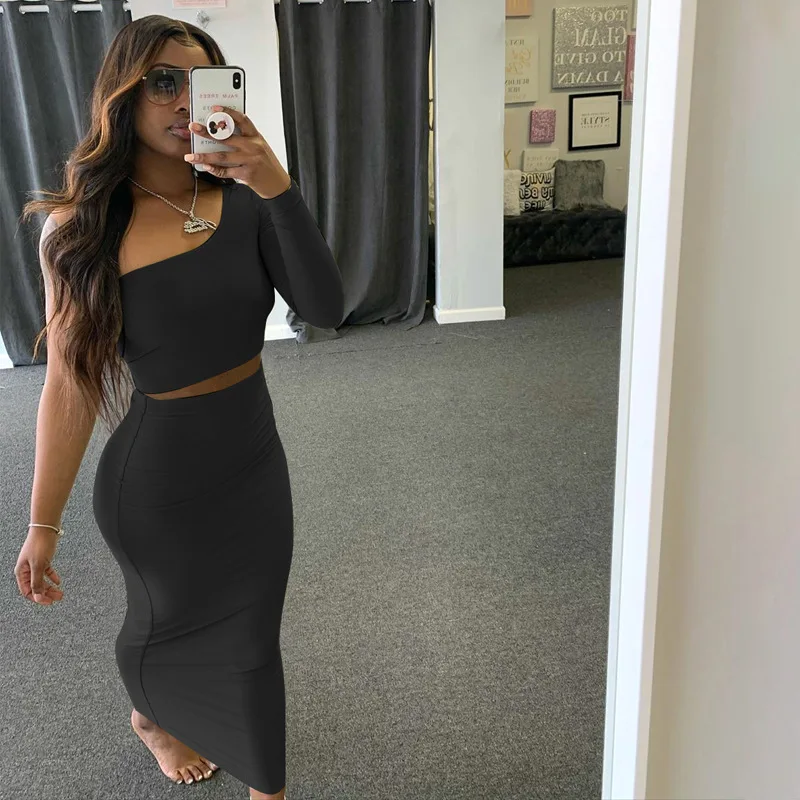 Женский комплект 2 шт., одежда на весну и осень однотонные Цвет платье на одно плечо с длинным рукавом Топы + юбка с высокой талией плотные юбки для девочек