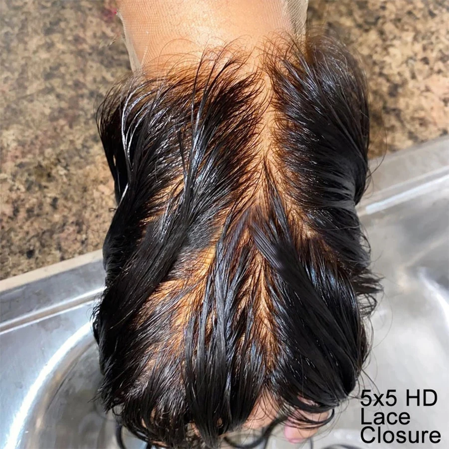 HD кружевное фронтальное Закрытие 5x5 невидимые кружевные предварительно выщипывающиеся волосы с объемными волнами бразильские Remy человеческие волосы HD кружева расплавленные шкуры