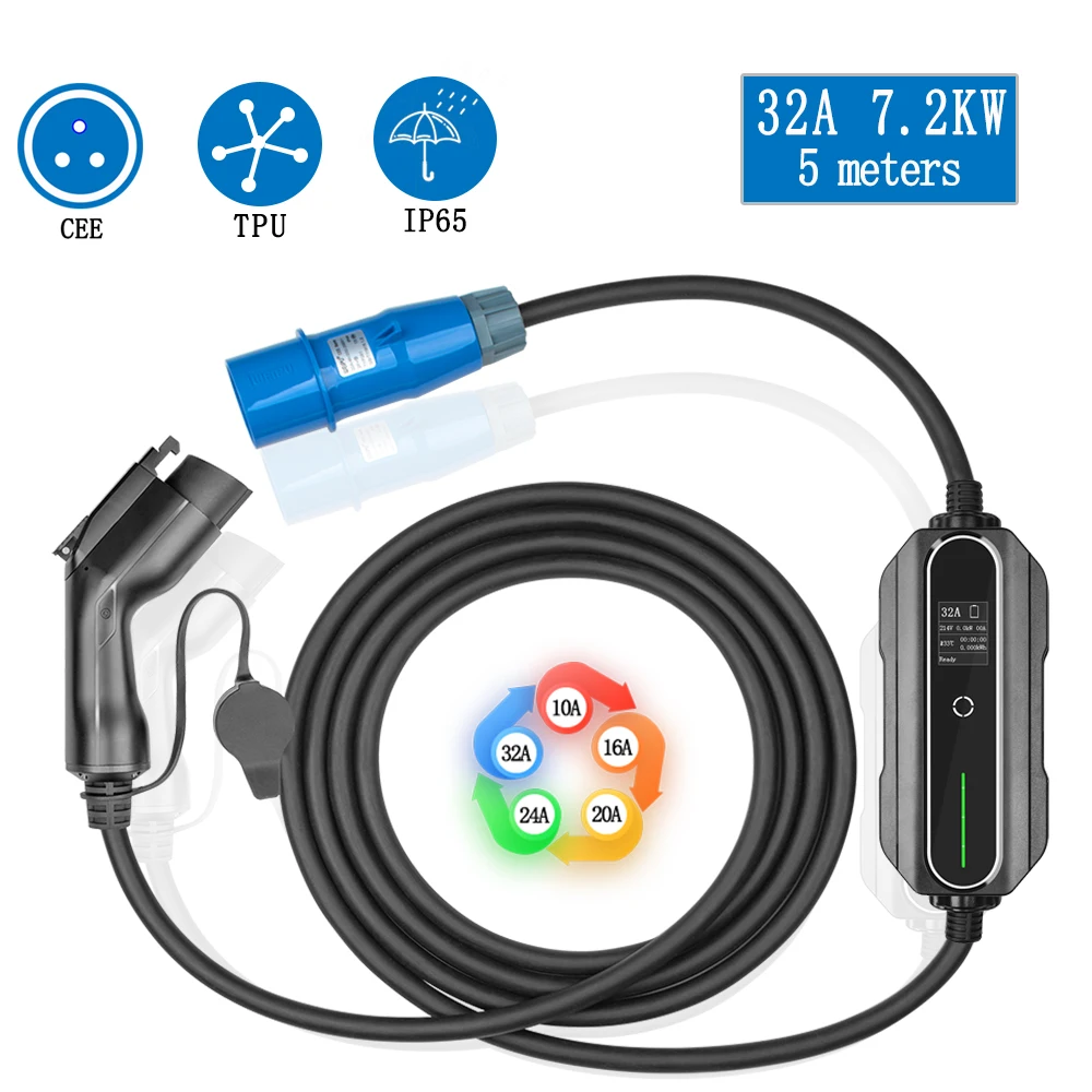 Регулируемое домашнее автомобильное зарядное устройство для электромобиля J1772 тип 1 вилка 32Amp EV портативное зарядное устройство 5 метров EV зарядный кабель с вилкой CEE