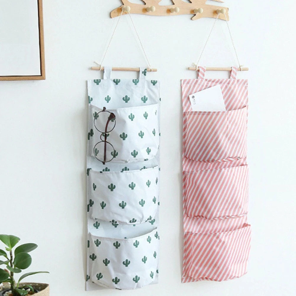 Настенная сумка для хранения, коробка для хранения с рисунком кактуса, фламинго, 3 кармана, коробка для хранения ювелирных изделий из хлопка и льна