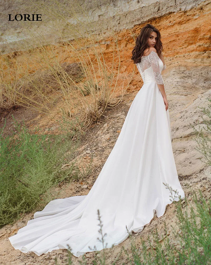 Платье свадебное атласное ТРАПЕЦИЕВИДНОЕ со шлейфом и открытыми плечами