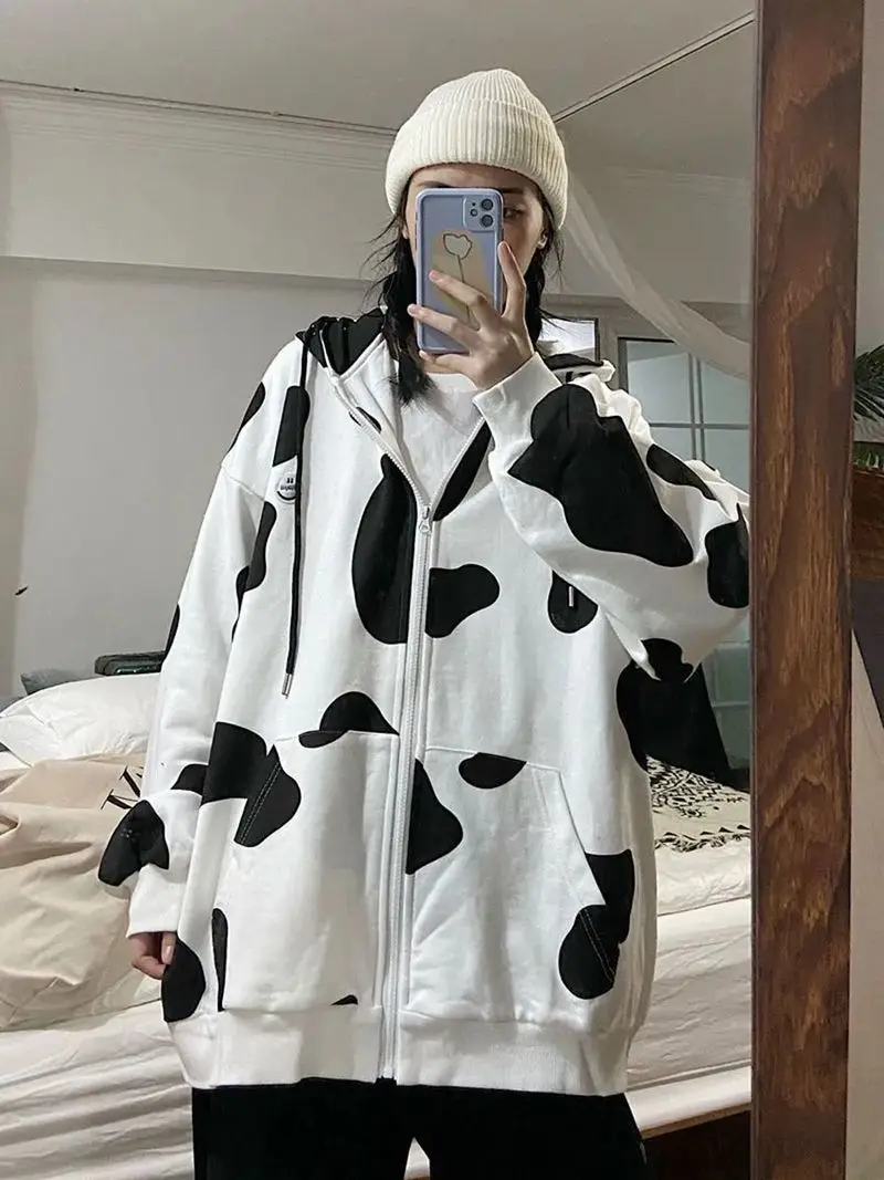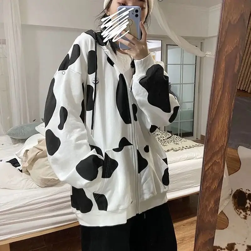 Толстовка женская с капюшоном Kawaii, осень 2020, корейский стиль Харадзюку, в стиле преппи, нишевая кофта на молнии с коровьим узором
