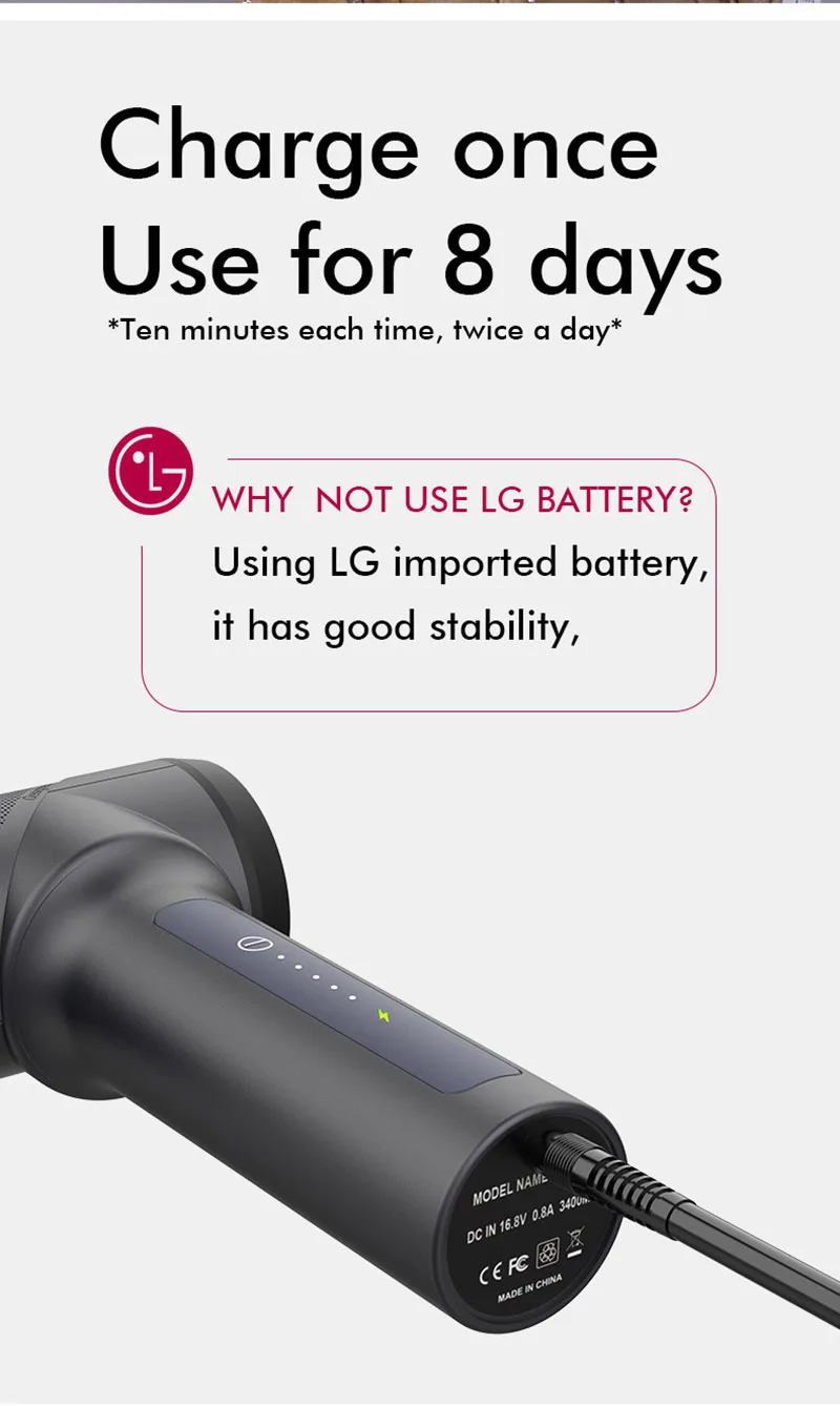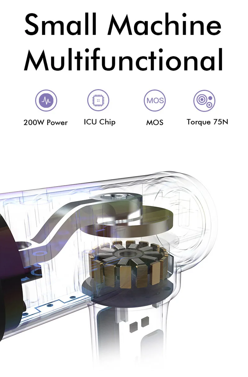 -Режим скорости: 5 скоростей с, 1200-3200 ударов в минуту.-Аккумулятор: оригинальный аккумулятор LG 3400 мАч, до 7 часов на зарядку.-Амплитуда: 12 мм.-Сила остановки: до 60 фунтов.-Насадка: 6 сменных головок.-Время зарядки: 2-3 часа.-Вес: 2 кг.