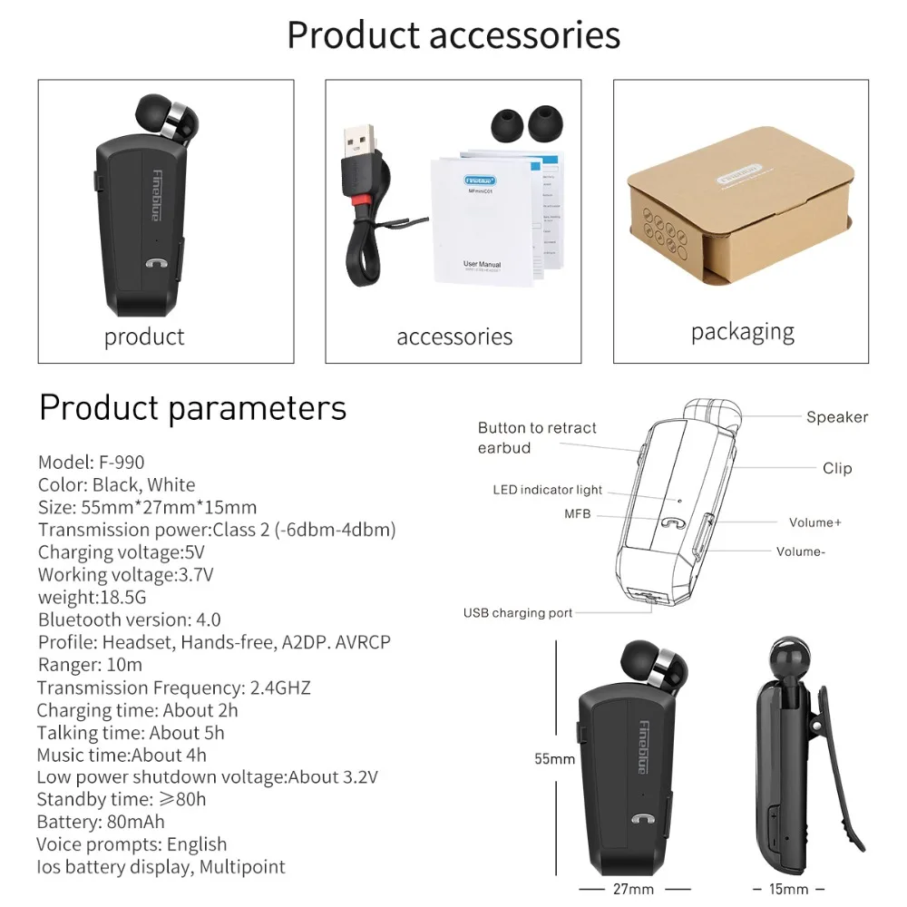Беспроводная деловая Bluetooth-гарнитура Fineblue F990 с телескопич...