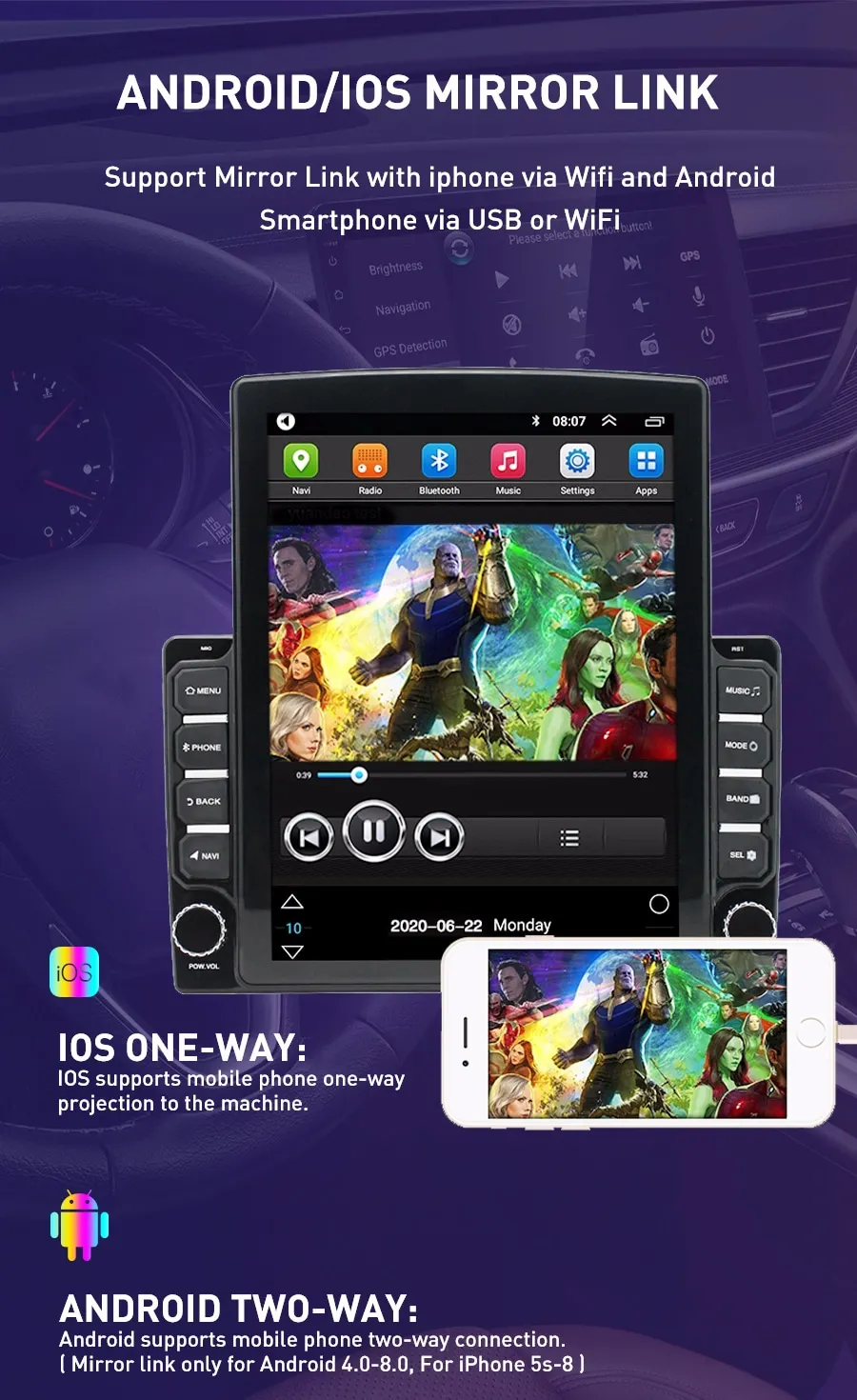 Мобильный телефон можно синхронизировать и отображать на экране автомобиля.Iphone через Wifi и Android смартфон через USB или WiFi
