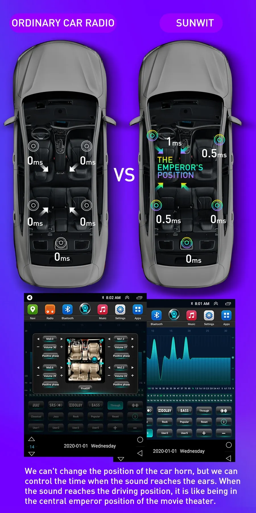 Версия 4G с 36EQ DSP, другая модель с многоступенчатым эквалайзеромДадим вам истинный звукВыполните все ваши ожидания звукаУстановив приблизительную систему объемного звучания и используя DSP, чтобы динамически компенсировать изменение звукового поля, оригинальный эффект записи полностью восстановлен и даст вам истинный звук.Контролируйте время, когда звук достигает ухаНаслаждайтесь объемным звуком C-bit