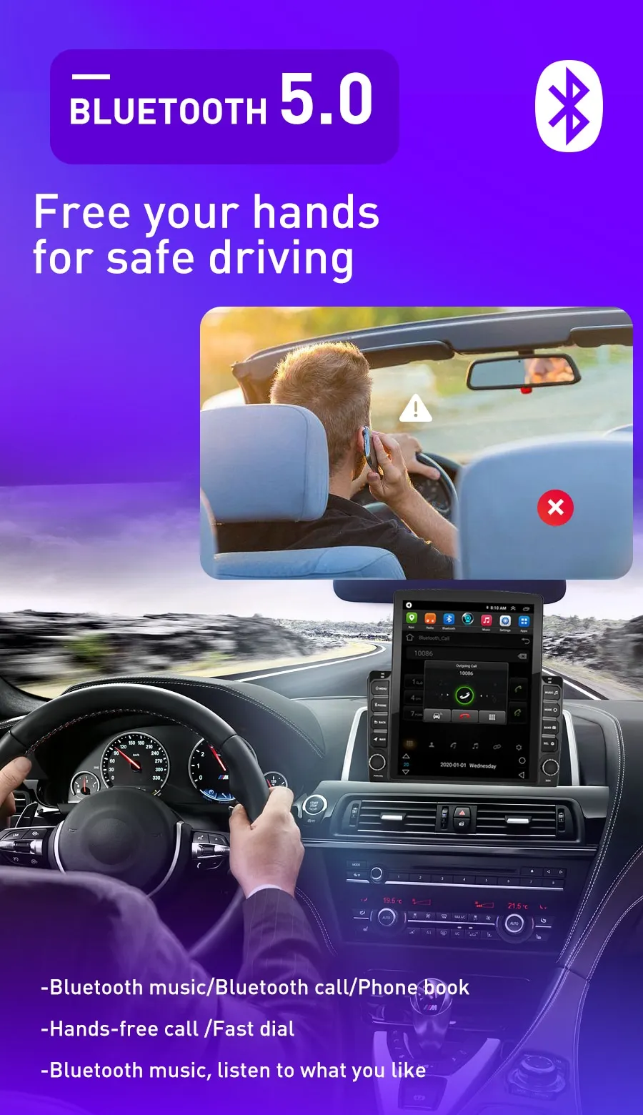 Освободите руки для безопасного вожденияBluetooth Музыка | Bluetooth Вызов | Телефонная книгаЗвонки без рук | Быстрый циферблатBluetooth музыка, слушайте то, что вам нравится