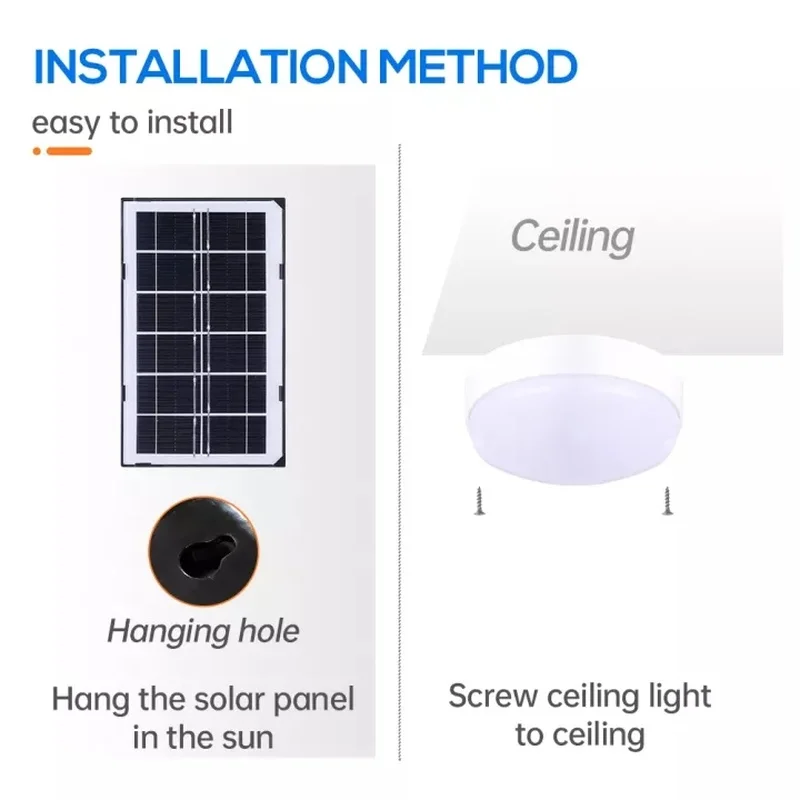 Аккумулятор солнечной потолочной лампы устанавливается в потолочную лампу, а не в солнечную панель, что означает, что даже если солнечная панель не подключена после полной зарядки, ее можно включить!