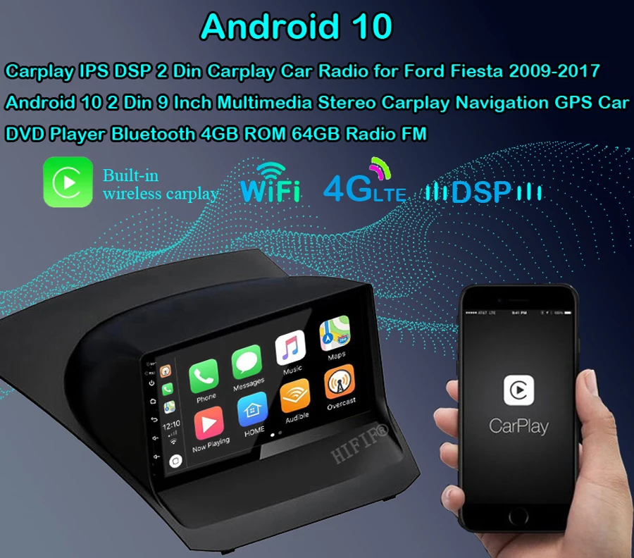 Автомагнитола для Ford Fiesta 2009-2017, Android 10, 2 Din, 9 дюймов, мультимедиа, стерео, Carplay, навигация, GPS, автомобильный DVD-плеер, Bluetooth