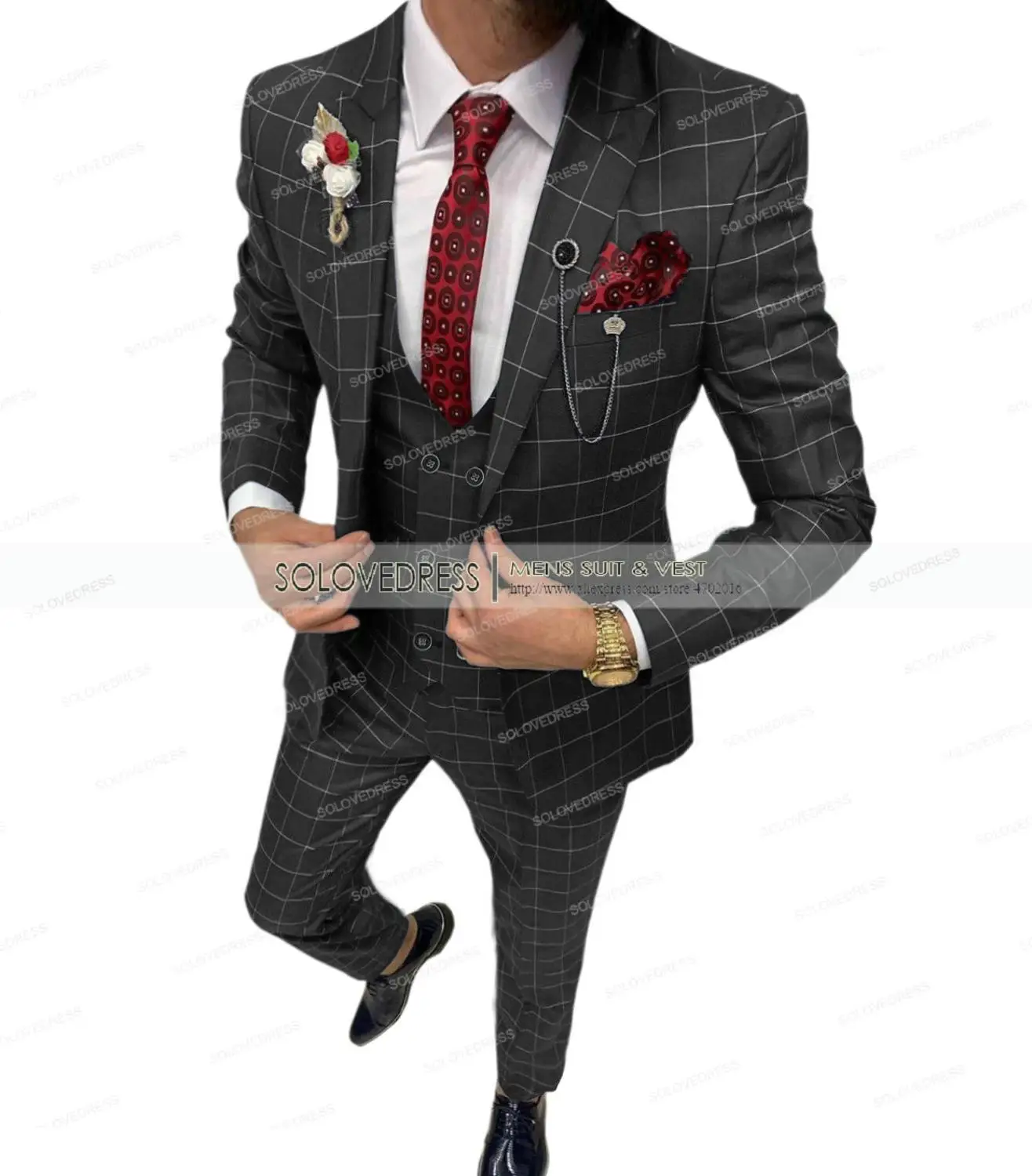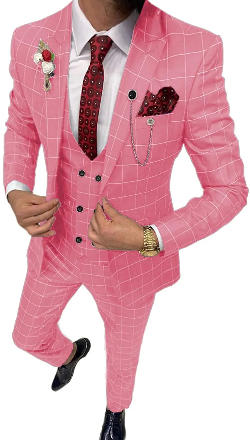 Розовый Повседневное Для мужчин костюм Slim Fit Тип комплект из 3 предметов двубортный из дышащего материала защитный чехол для мобильного телефона, в клетку, тонкое платье для выпускного вечера куртка вечерние дорожная сумка