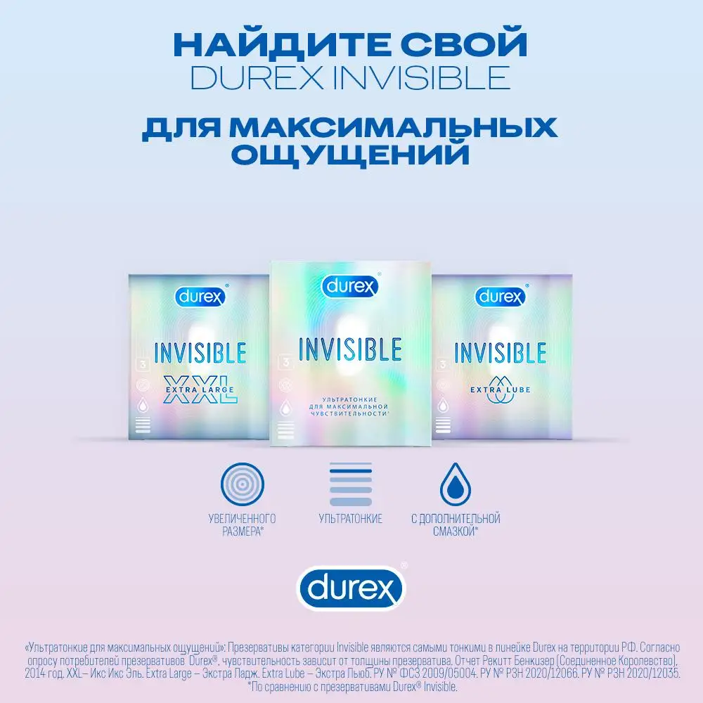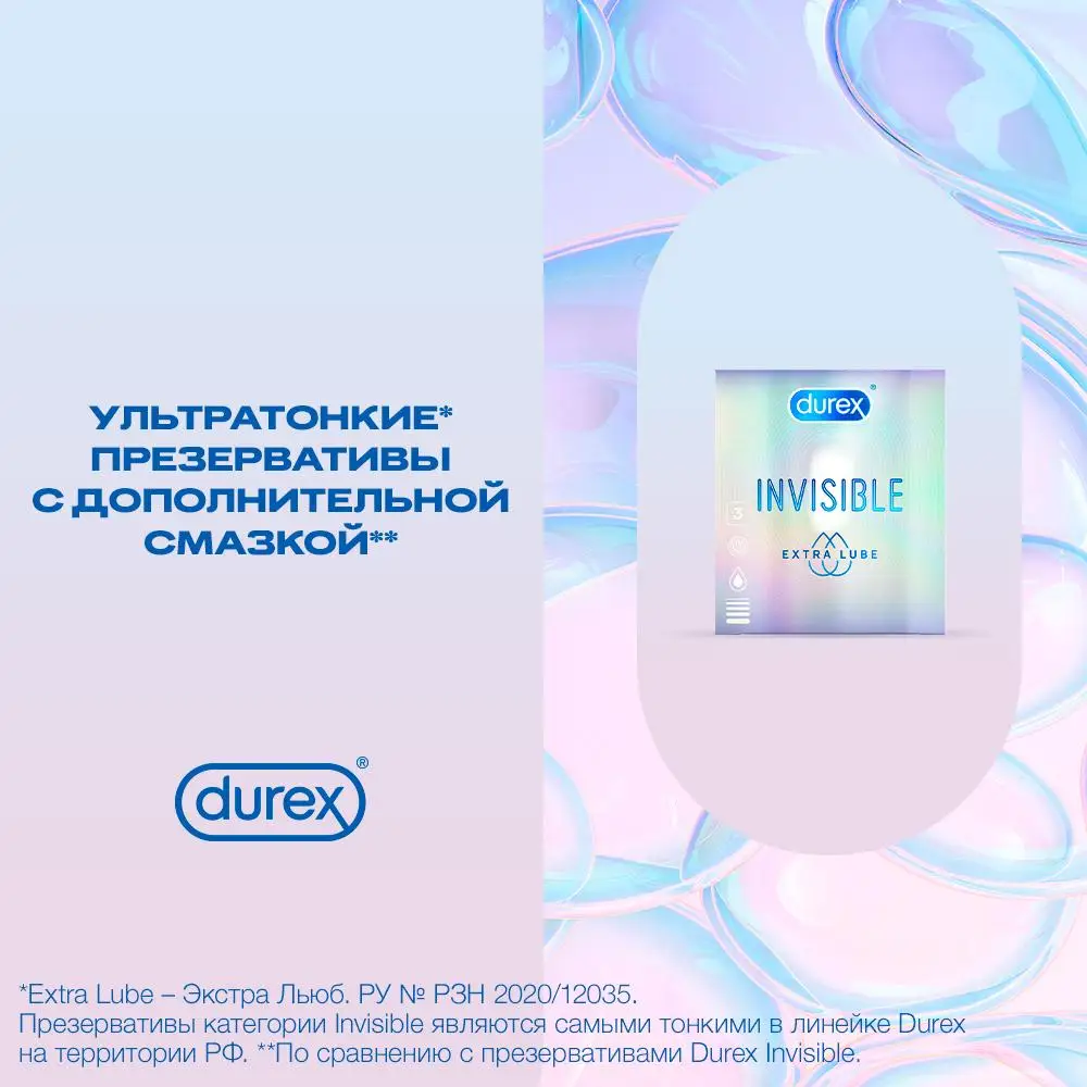 Ультратонкие невидимые дополнительные презервативы со смазкой Durex предназначены для повышения чувствительности *, обеспечивая при этом высокое качество. С дополнительной смазкой ** для большего ощущения гладкости. Durex invisible extra lube с дополнительным гелем-смазка-гладкая, с приводом, бесцветная, изготовлена из натурального латекса, без какого-либо дискомфорта. Номинальные размеры: length-180mm, width-52mm. Проверены. 100% проверено электроникой. Ни один из способов контрацепции не может гарантировать 100% защиту от нежелательной беременности, ВИЧ или других заболеваний, передающихся половым путем. * Невидимые Презервативы являются самым тонким в линии Durex. ** По сравнению с невидимыми презервативами Durex.