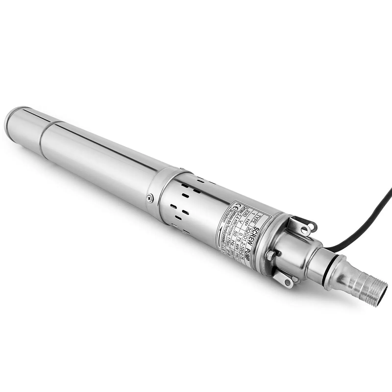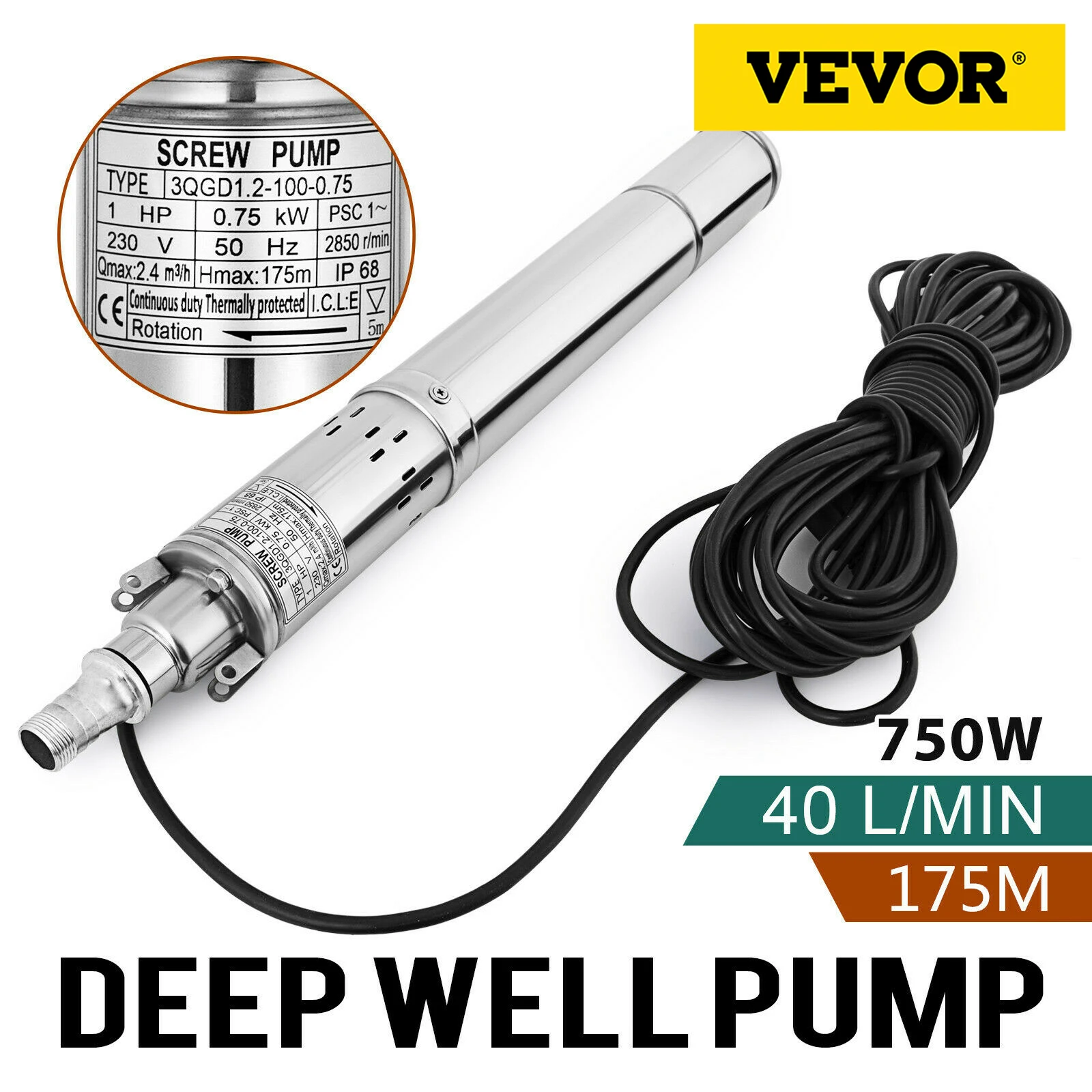 Напряжение: 230 В Частота: 50 Гц Мощность: 750 Вт Лошадиная Мощность: 1 л.с. Максимальный расход: 2,4М³/ч(40 л/мин) Максимальная головка: 574 фута/175 М Скорость: 2850 об/мин Кабель: 49 футов/15 м Класс защиты: IP68Посылка