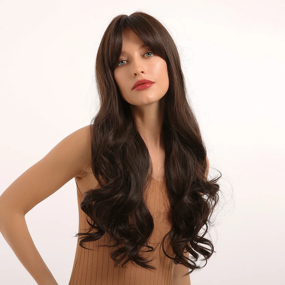 ESIN синтетические темно-коричневые волосы парики длинные натуральные волнистые волосы для женщин длинные парики с челкой Бесплатная доставка Термостойкие