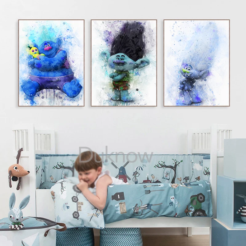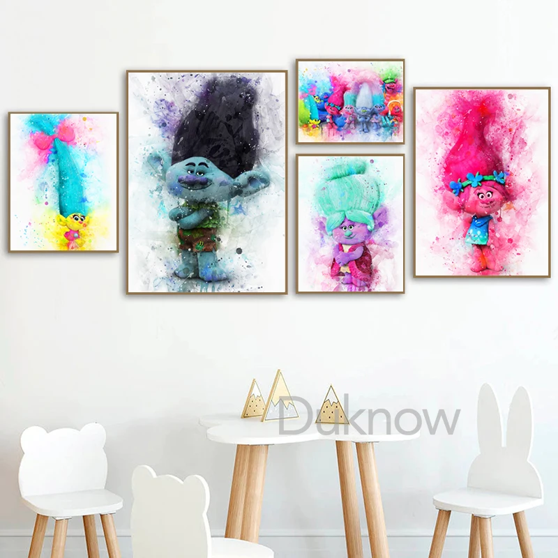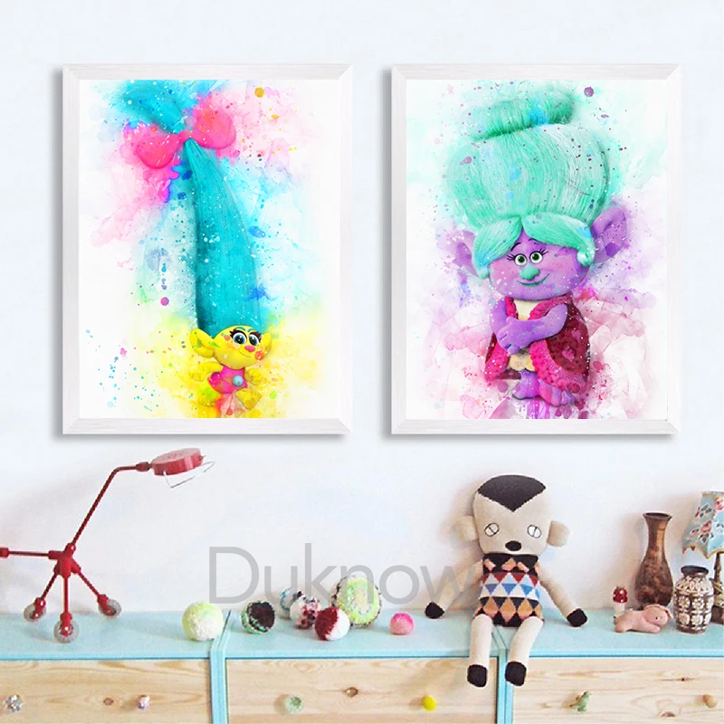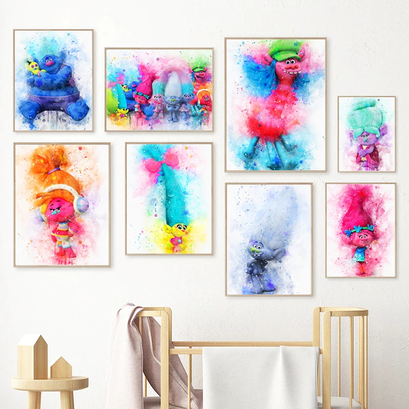 Рисунок ветки и королевы Поппи тролли, холст, постер, абстрактная Акварельная живопись, Настенная картина для детской, декор для детской комнаты