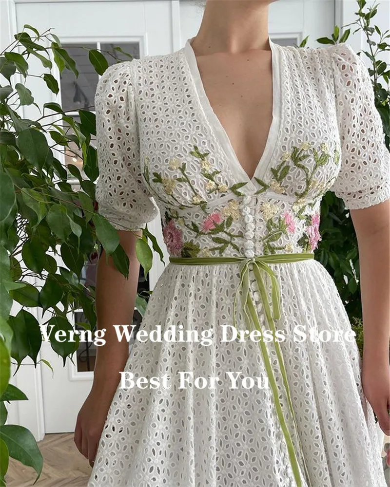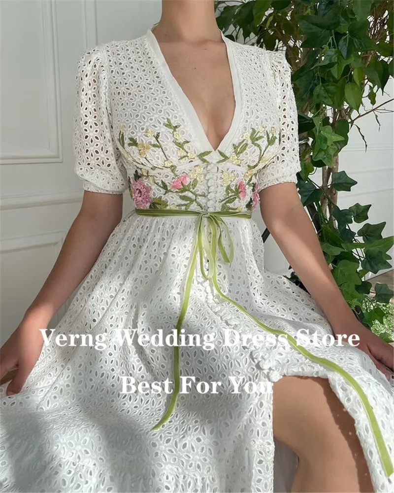 Винтажное кружевное свадебное платье Verngo цвета слоновой кости, с аппликацией, V-образным вырезом, рукавом до локтя, передним разрезом и длиной до щиколотки, наряды для невествечерние