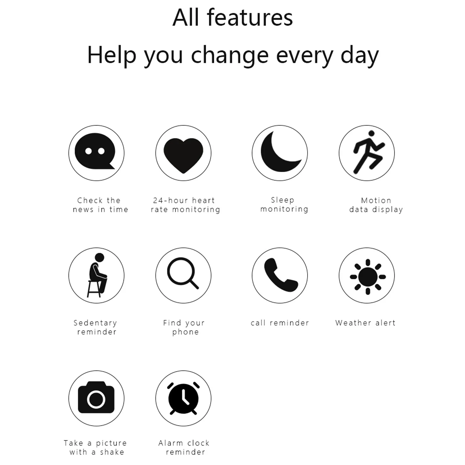 Функции: Измерение частоты сердечных сокращений, измерение артериального давления, измерение уровня кислорода в крови Измерение, информация о погоде, информация о сне, на ощупь, здоровье Мониторинг, фонарик, загрузка приложений, яркий экран, отображение времени, Удаленная камера, управление музыкой, секундомер, не беспокоить настройки режима, Ищите браслет Упражнения Запись: подсчет шагов, время упражнений, пробег упражнений, калорий Потребление, мониторинг сна, загрузка приложения для сохранения данных о сне Умное напоминание: телефон, сообщение, QQ, WeChat, больше новостей Спортивный режим (Ходьба/бег/Велоспорт/скакалка/Бадминтон/Баскетбол/ Футбол/плавание)Параметр: