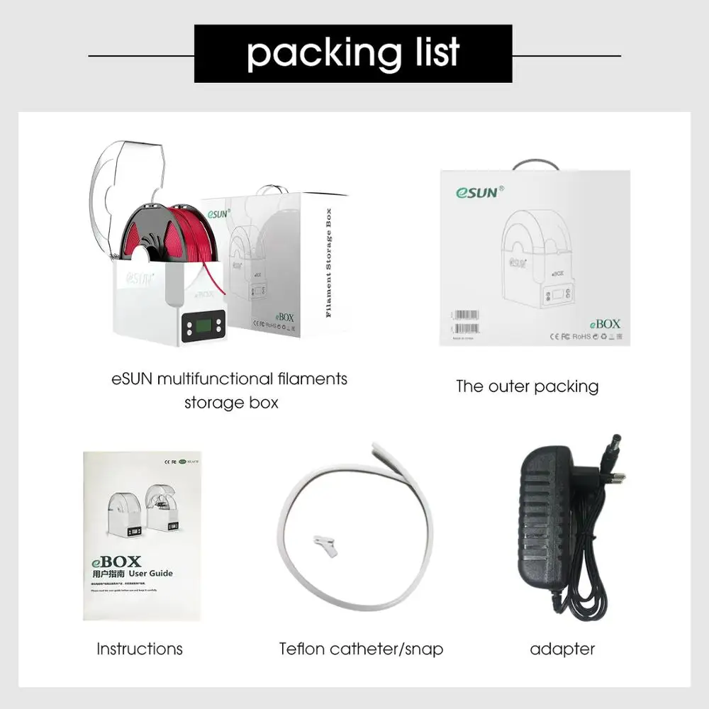 Размер посылка: 249 (Д) × 138 (Ш) × 272,5 (В) ммРазмер изделия: 215 (Д) × 104 (Ш) × 238,5 (В) ммМаксимальная емкость: 200 × 73 (В) ммВес изделия: 750 гНоминальная Мощность: AC100-240V ~ 50/60HzВыходная мощность: DC12V ~ 3AМощность сушильного нагревателя: 36 ВтМаксимальная температура: 80 ℃Взвешивания Мощность: 0,1 WВесовая нагрузка: 2 кгОшибка взвешивания: ± 0,02 КГНити Диаметр: 1,75 мм/2,85 мм/3 мм
