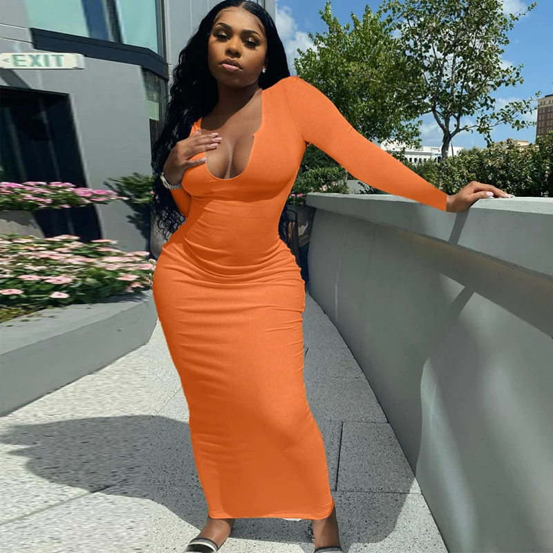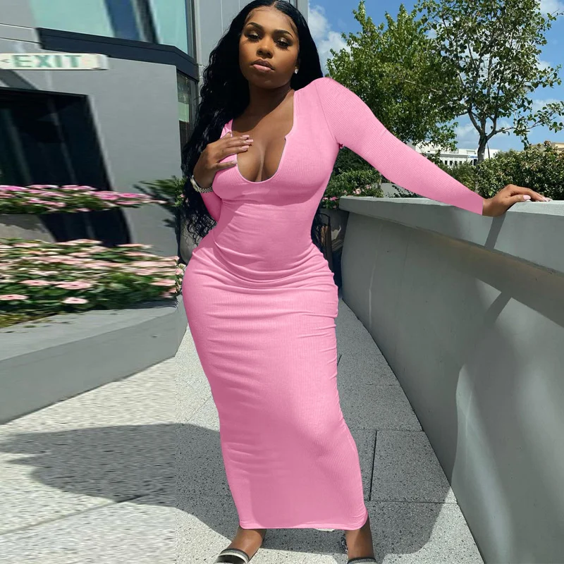 Женское трикотажное платье-миди с длинным рукавом и V-образным вырезом